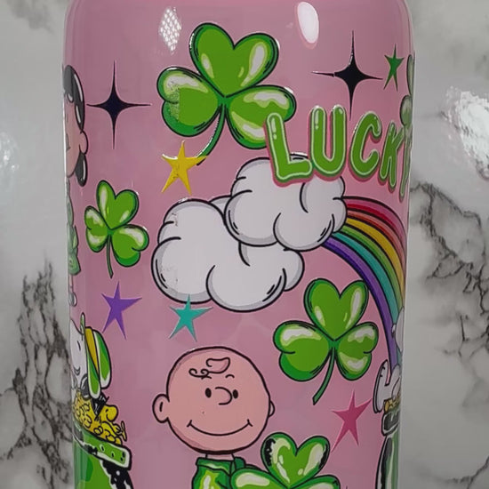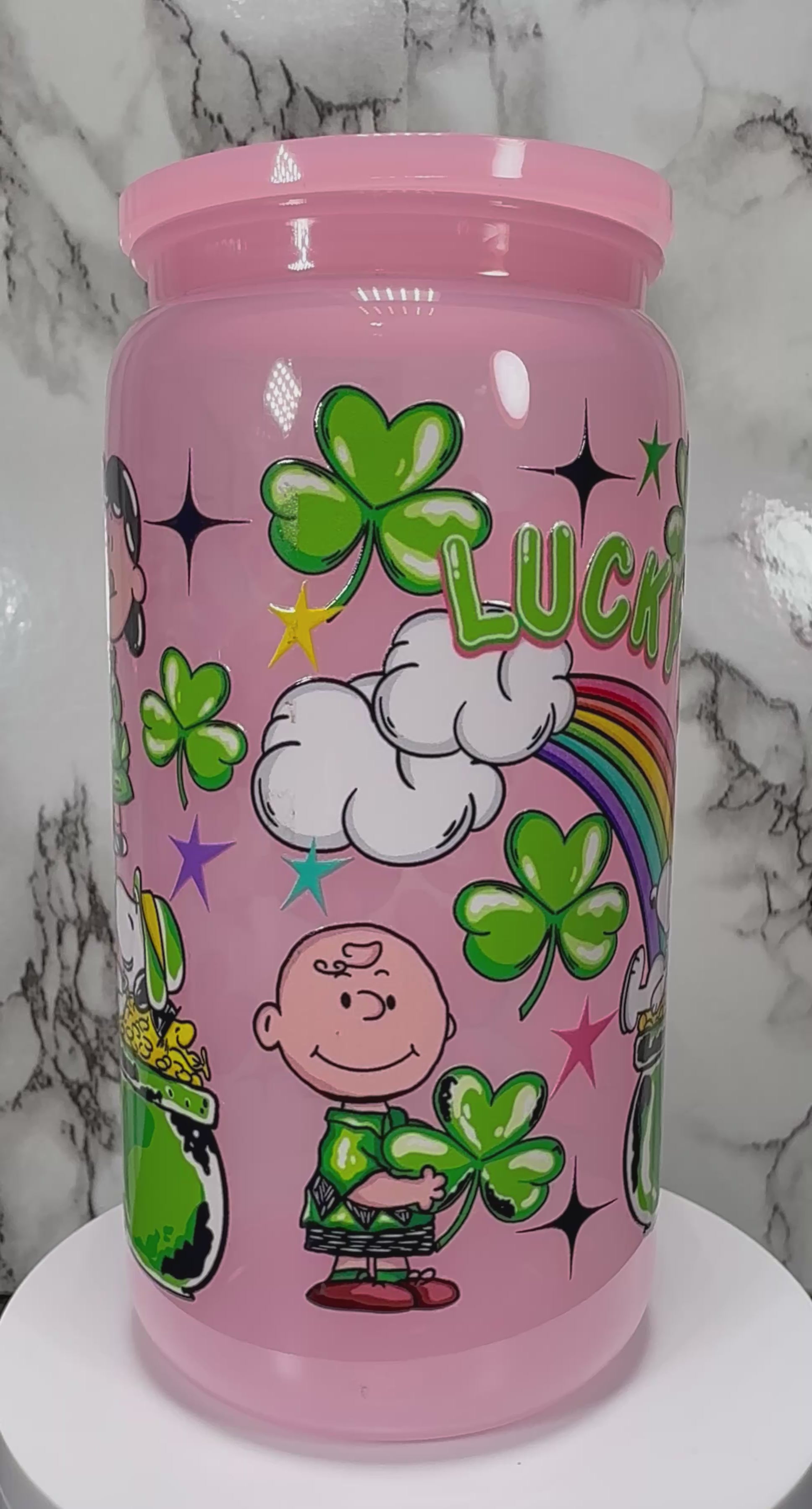 A Charlie Brown St. Patrick’s Day UVDTF on a pink PLASTIC beer can cup