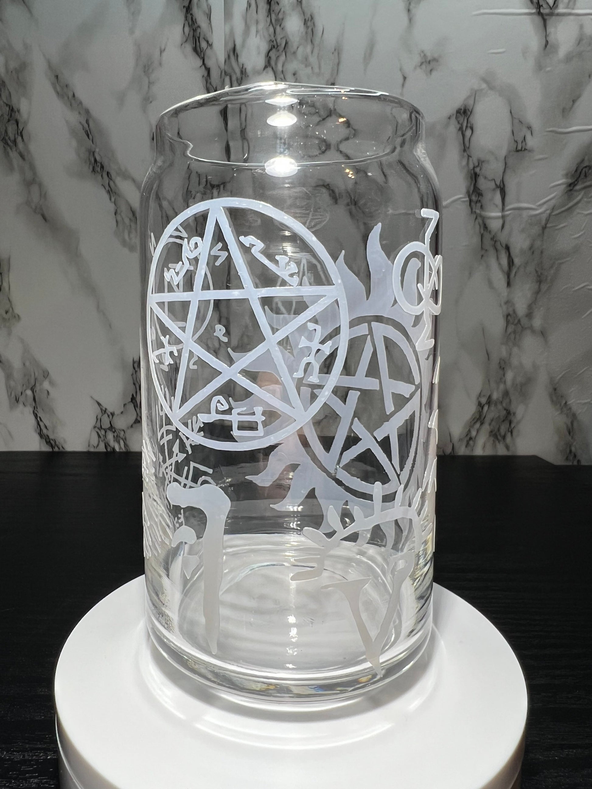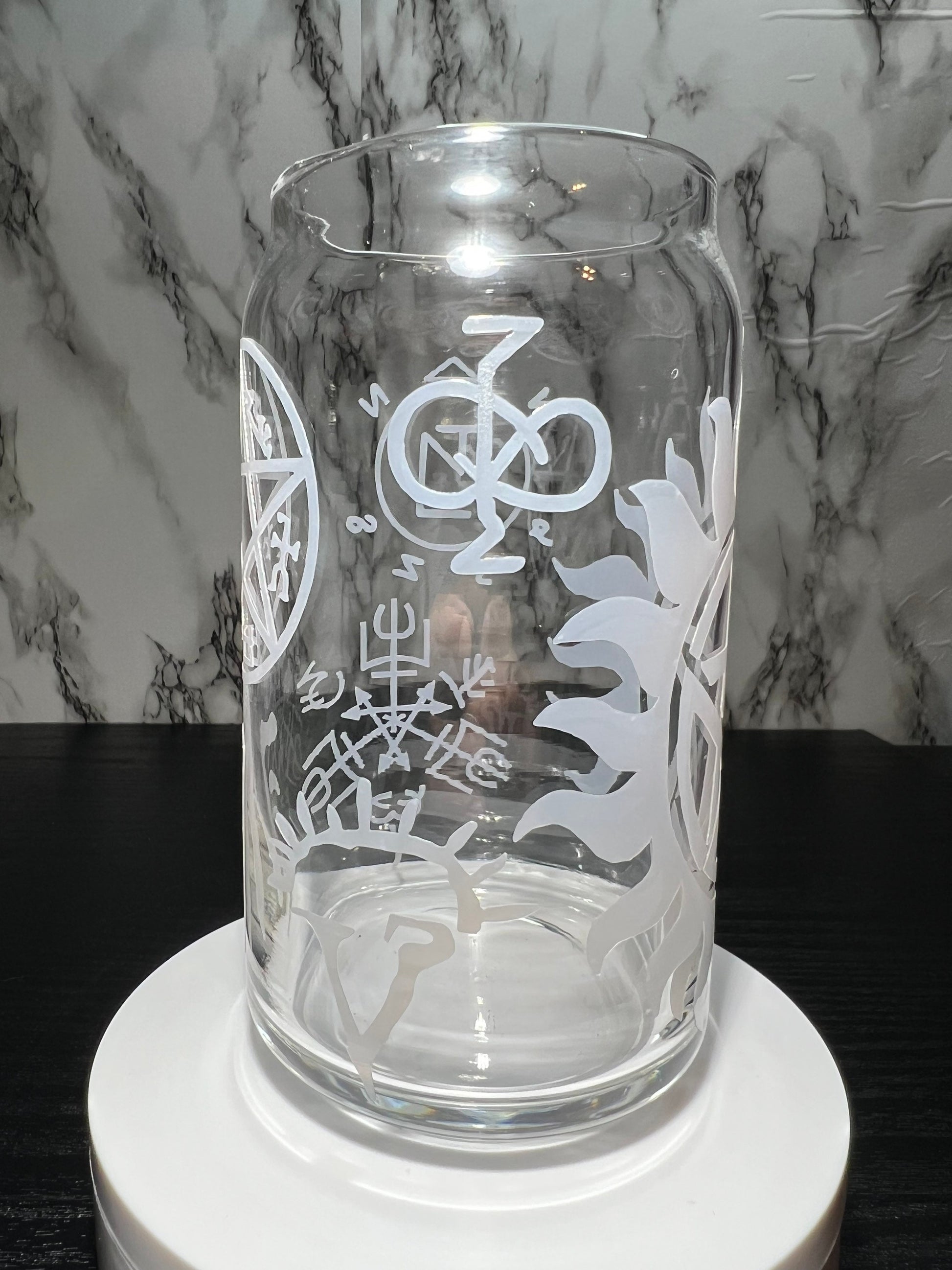 All Red Supernatural sigils color changing permanent vinyl on a libbey beer can glass