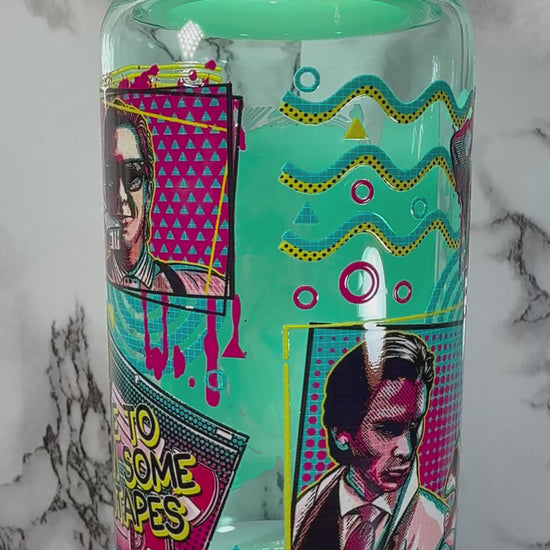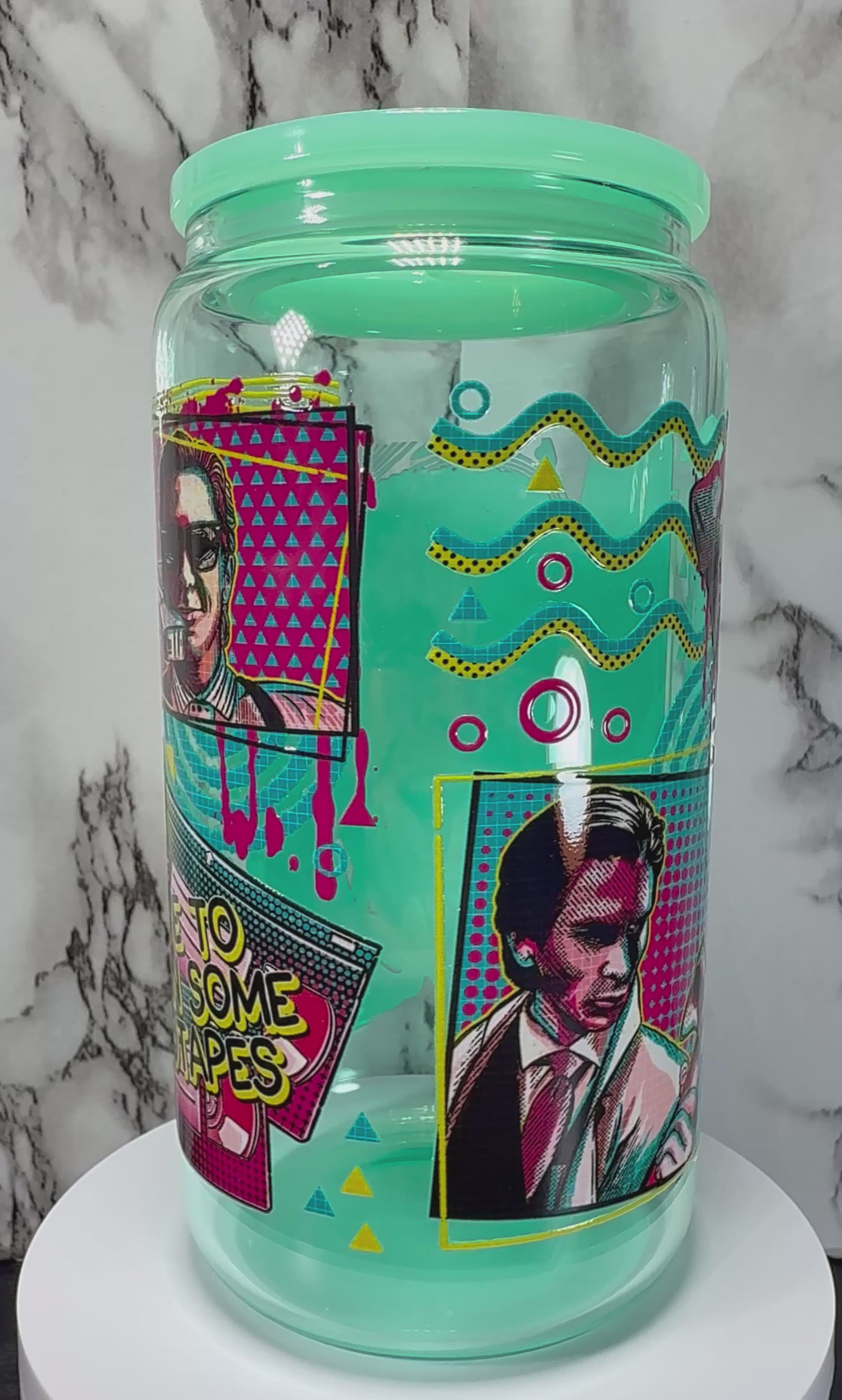 American Psycho Patrick Bateman UVDTF on a teal beer can glass