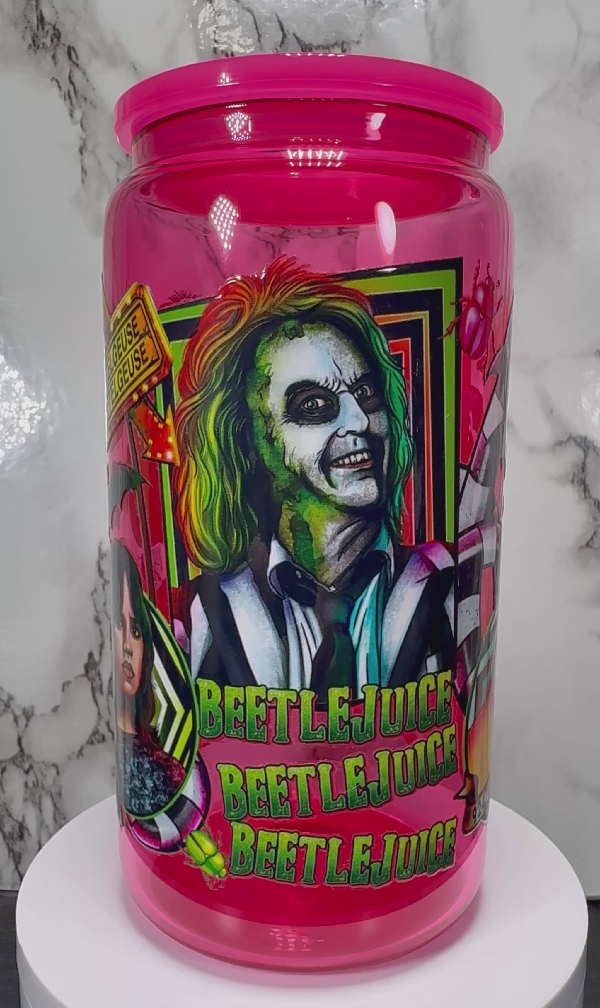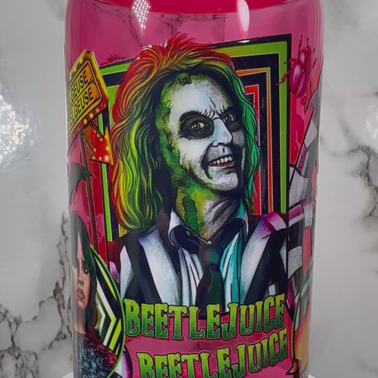 Beetlejuice UVDTF on a hot pink beer can glass