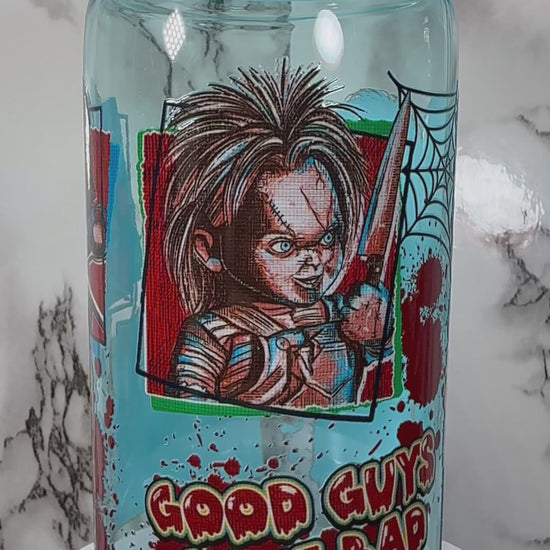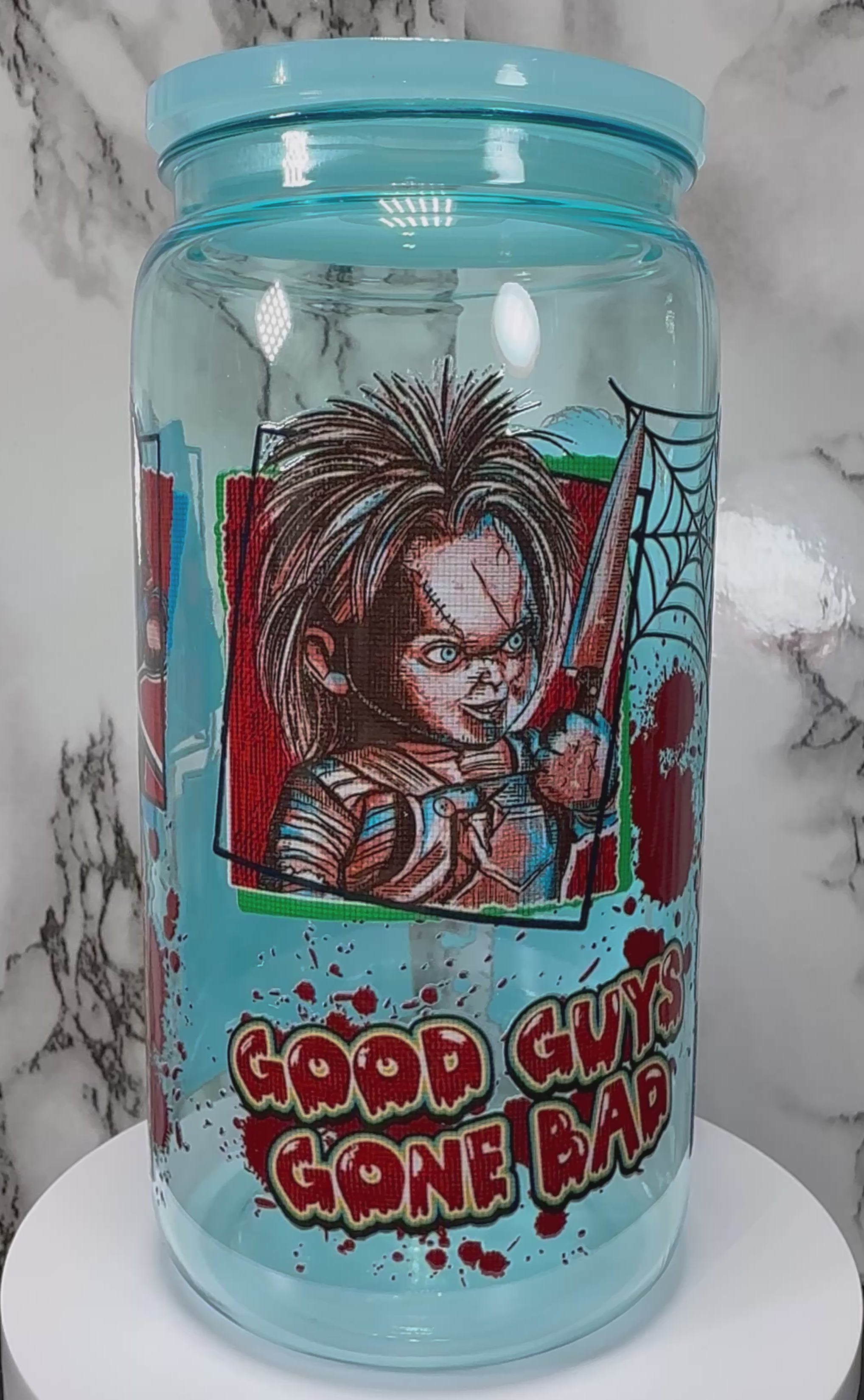 Chucky UVDTF on a blue PLASTIC beer can cup