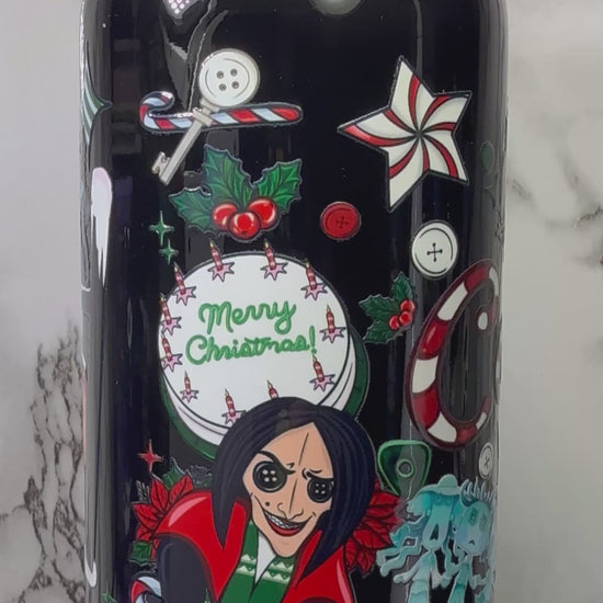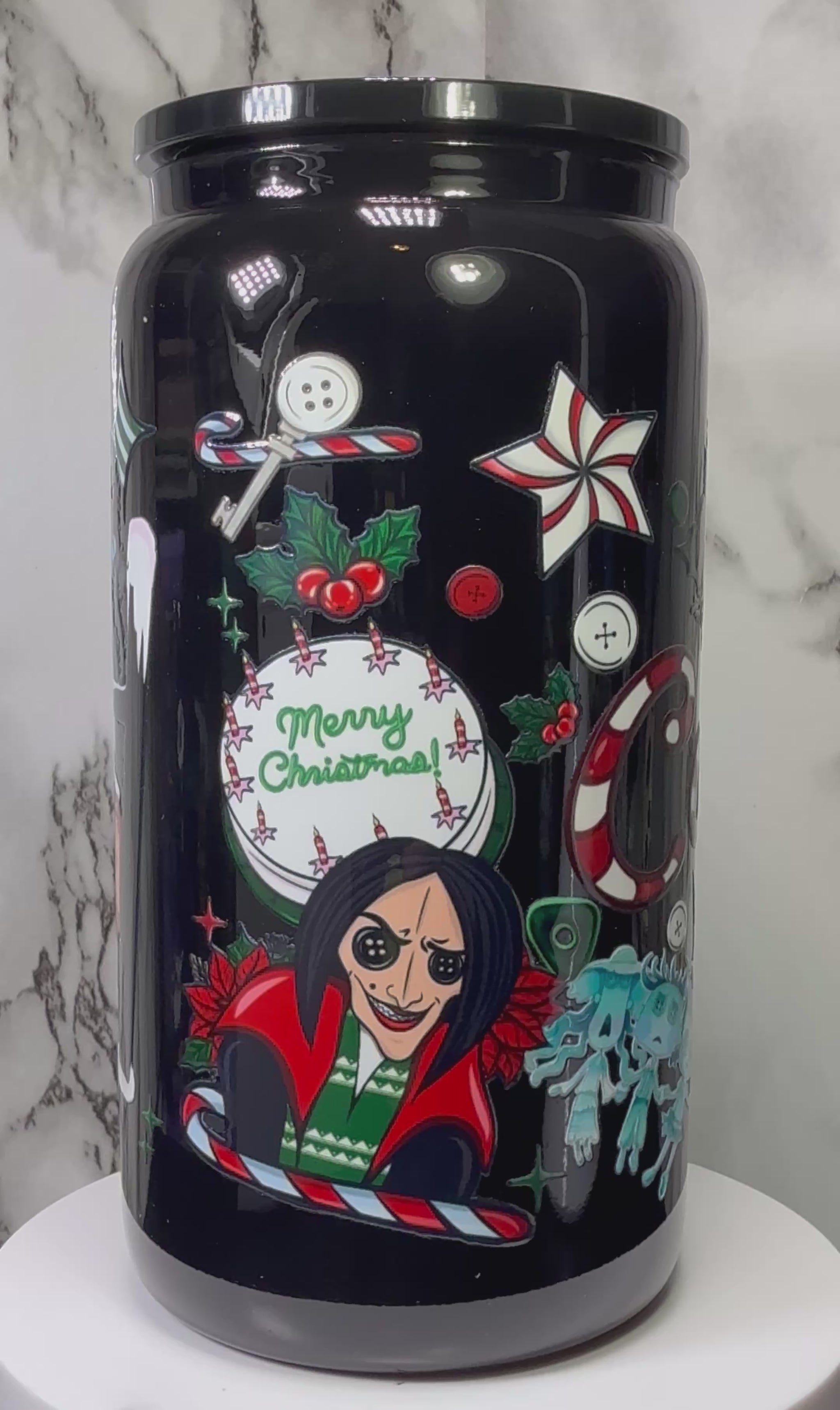 Coraline Christmas UVDTF on either a black plastic or black glass beer can cup