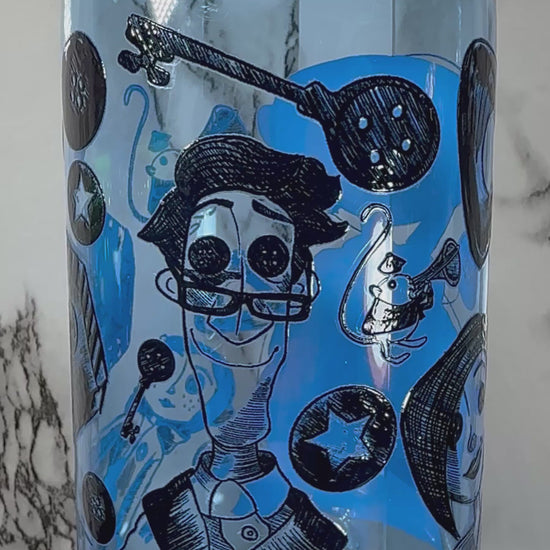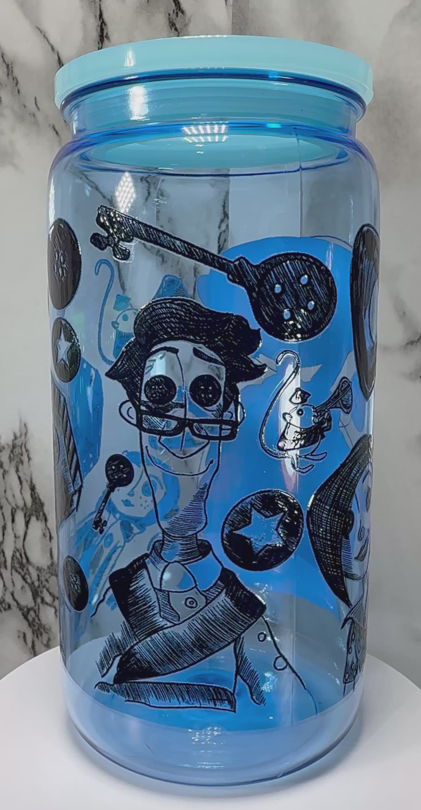 Coraline UVDTF on a blue PLASTIC beer can cup