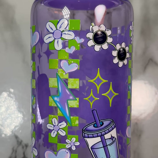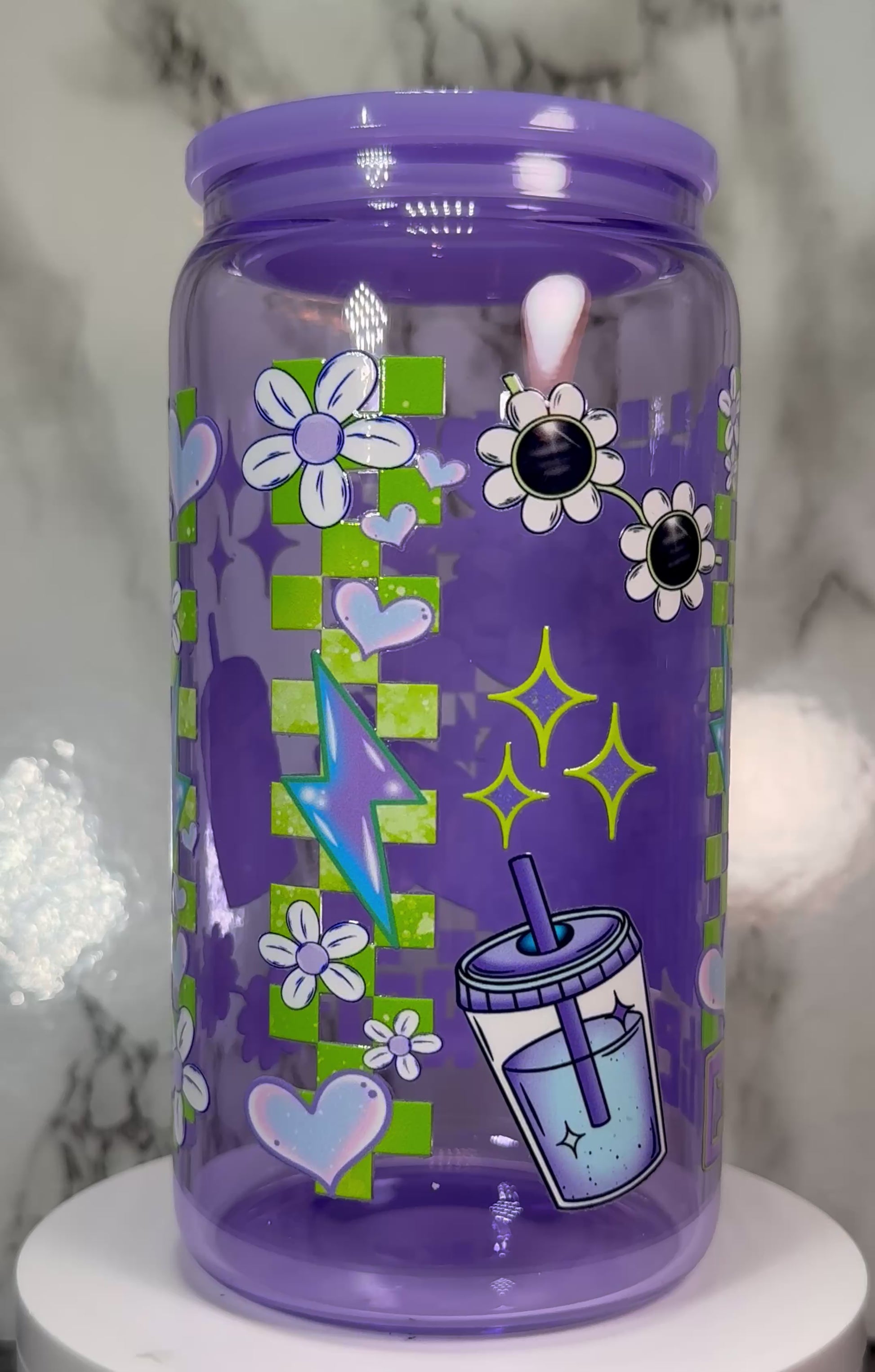 Cute & Feral Raccoon UVDTF on a purple beer can glass