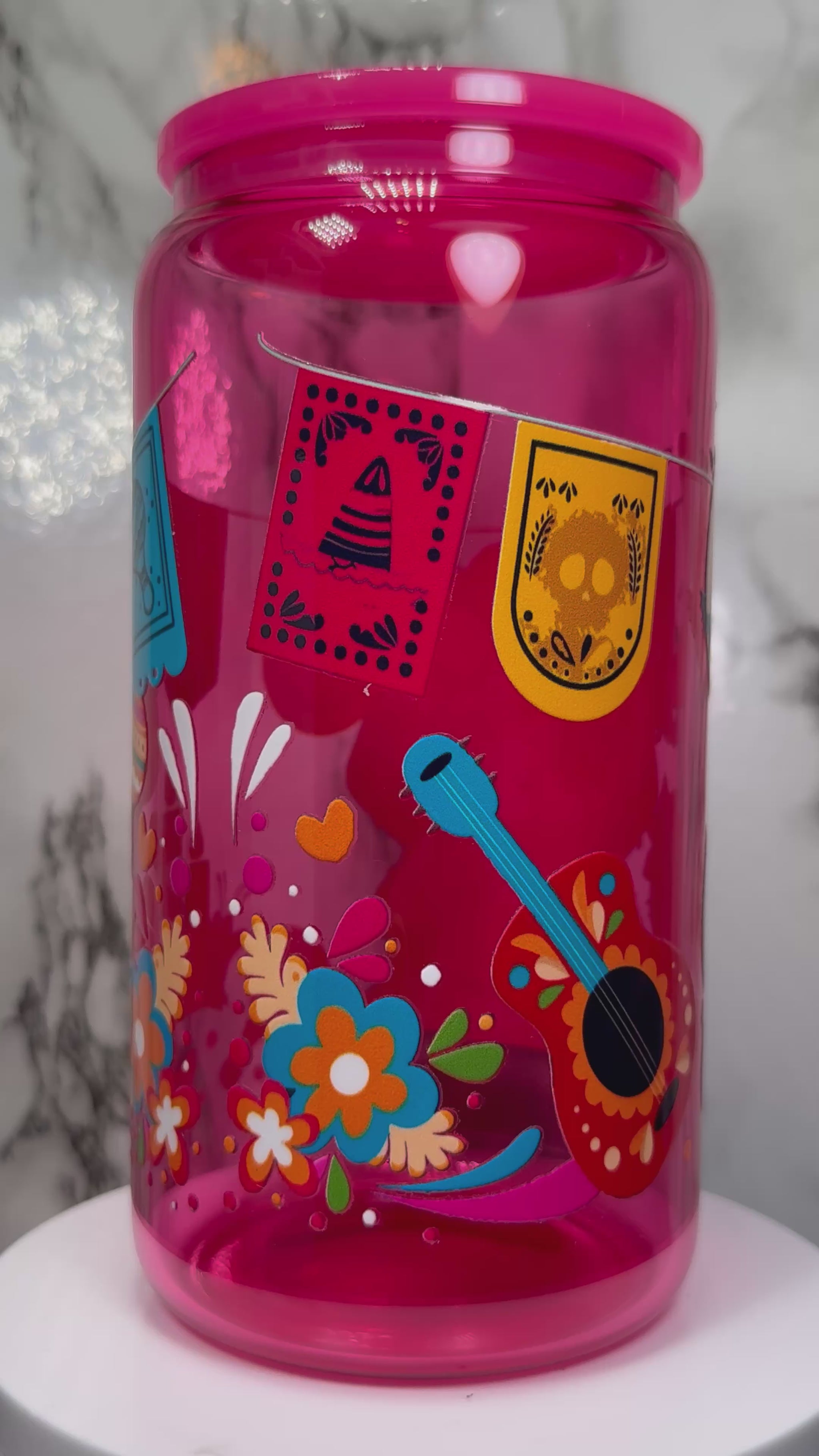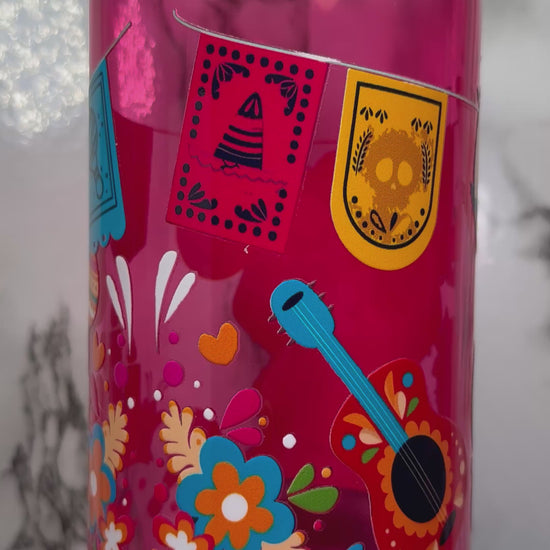 Dia De Los Muertos Hello Kitty UVDTF on a hot pink beer can glass