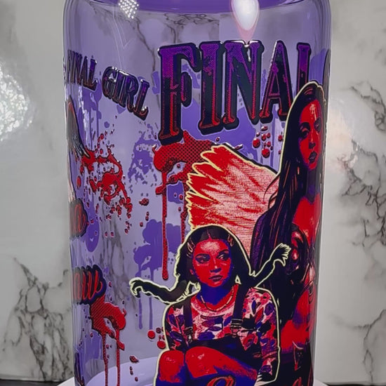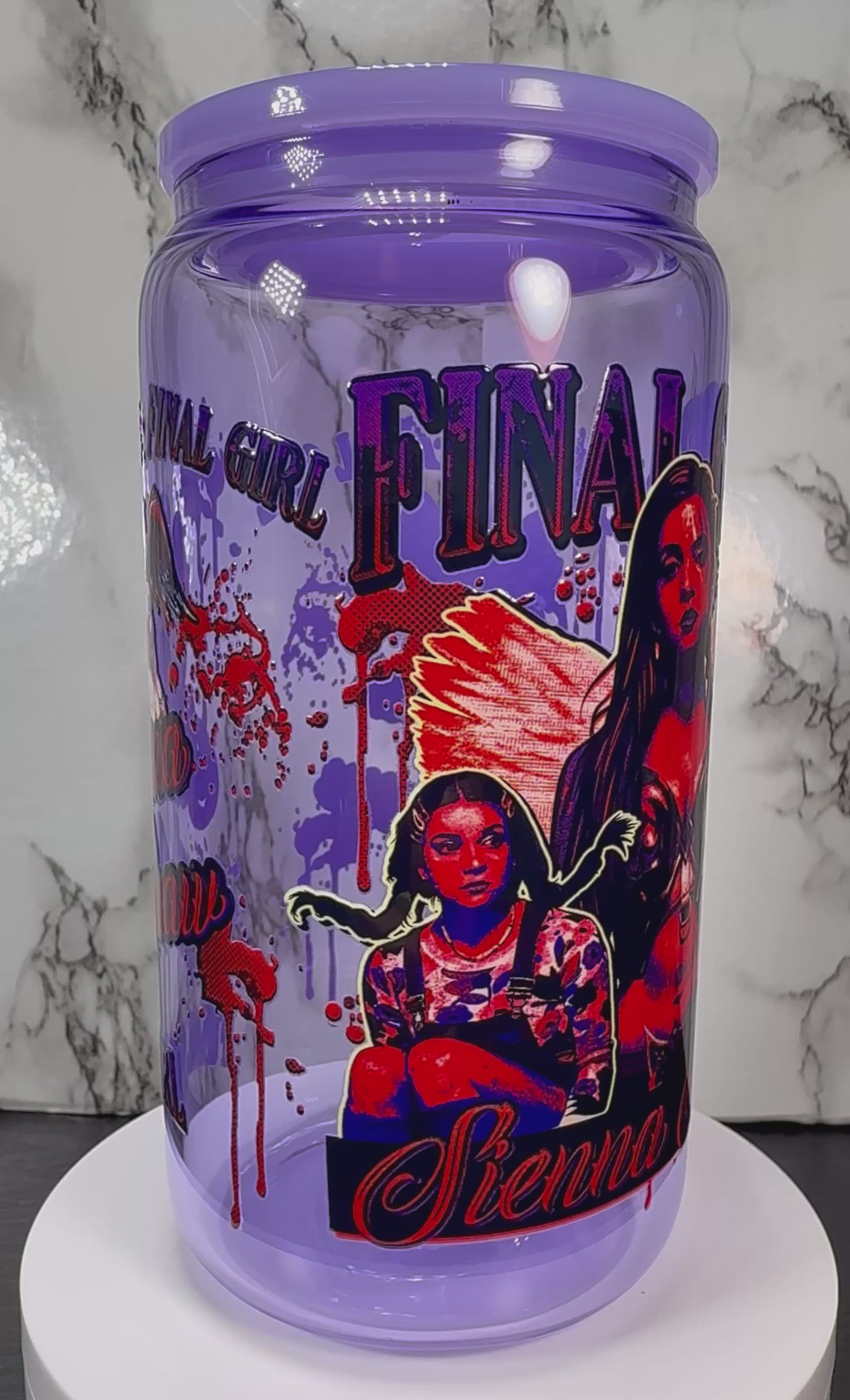Final Girl Sienna Shaw Terrifier UVDTF on a purple beer can glass