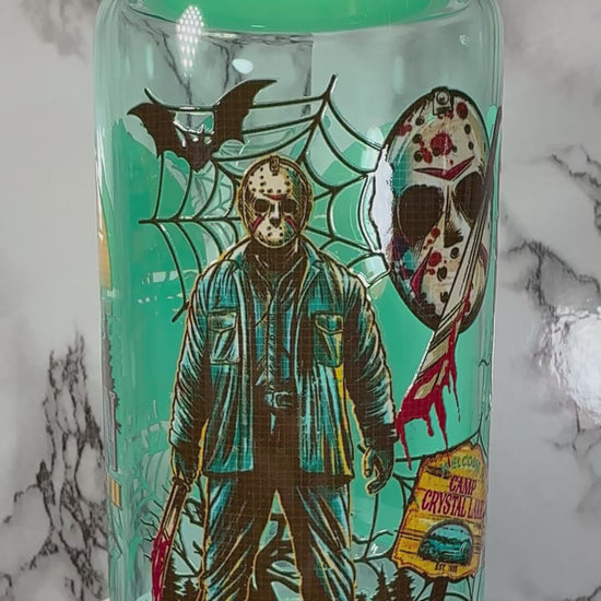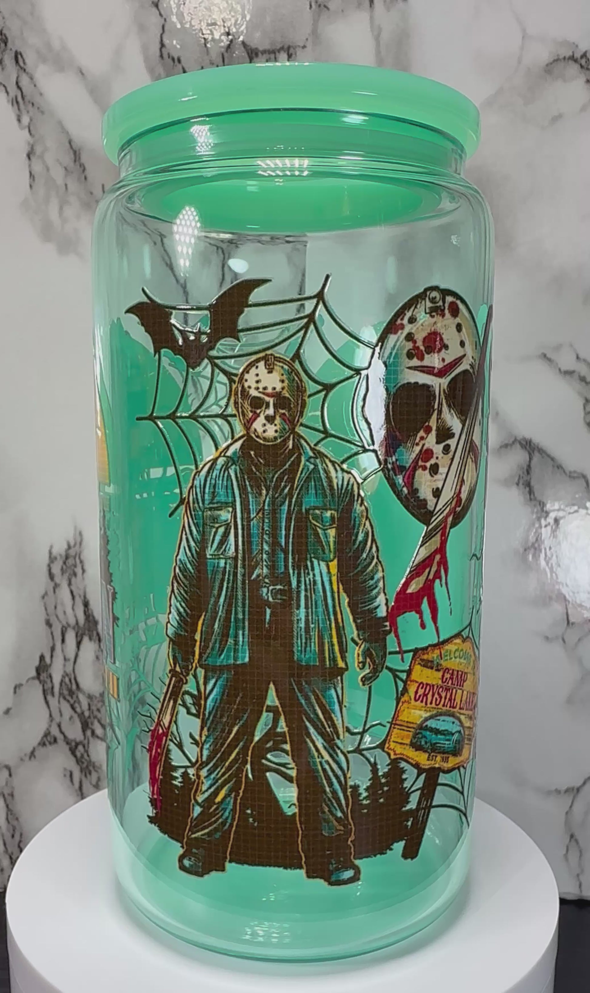 Friday the 13th Jason Voorhees UVDTF on a teal beer can glass