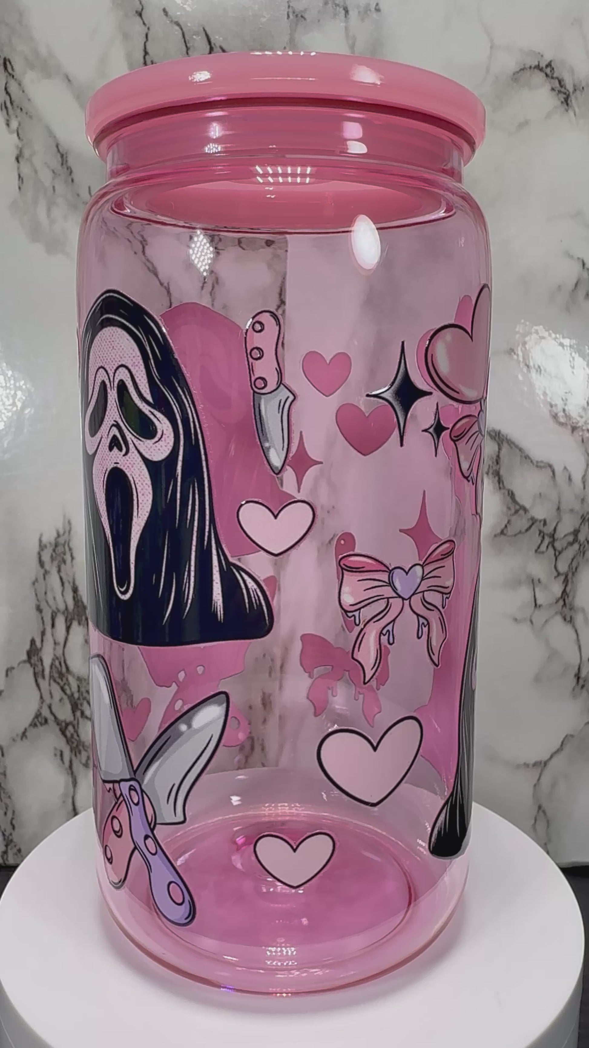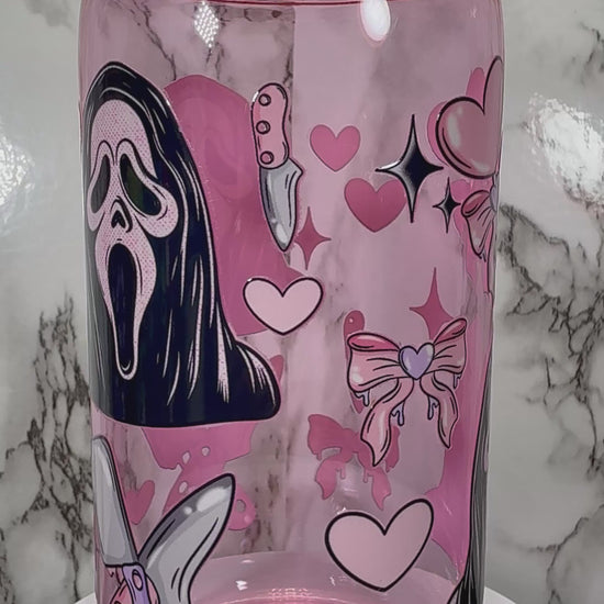 Ghostface Hearts UVDTF on a PLASTIC pink beer can cup