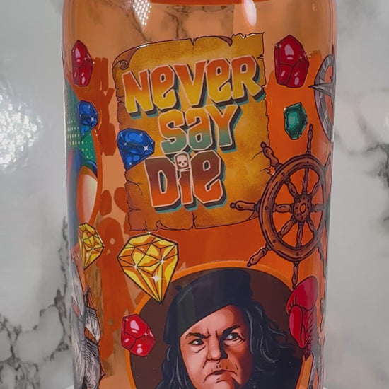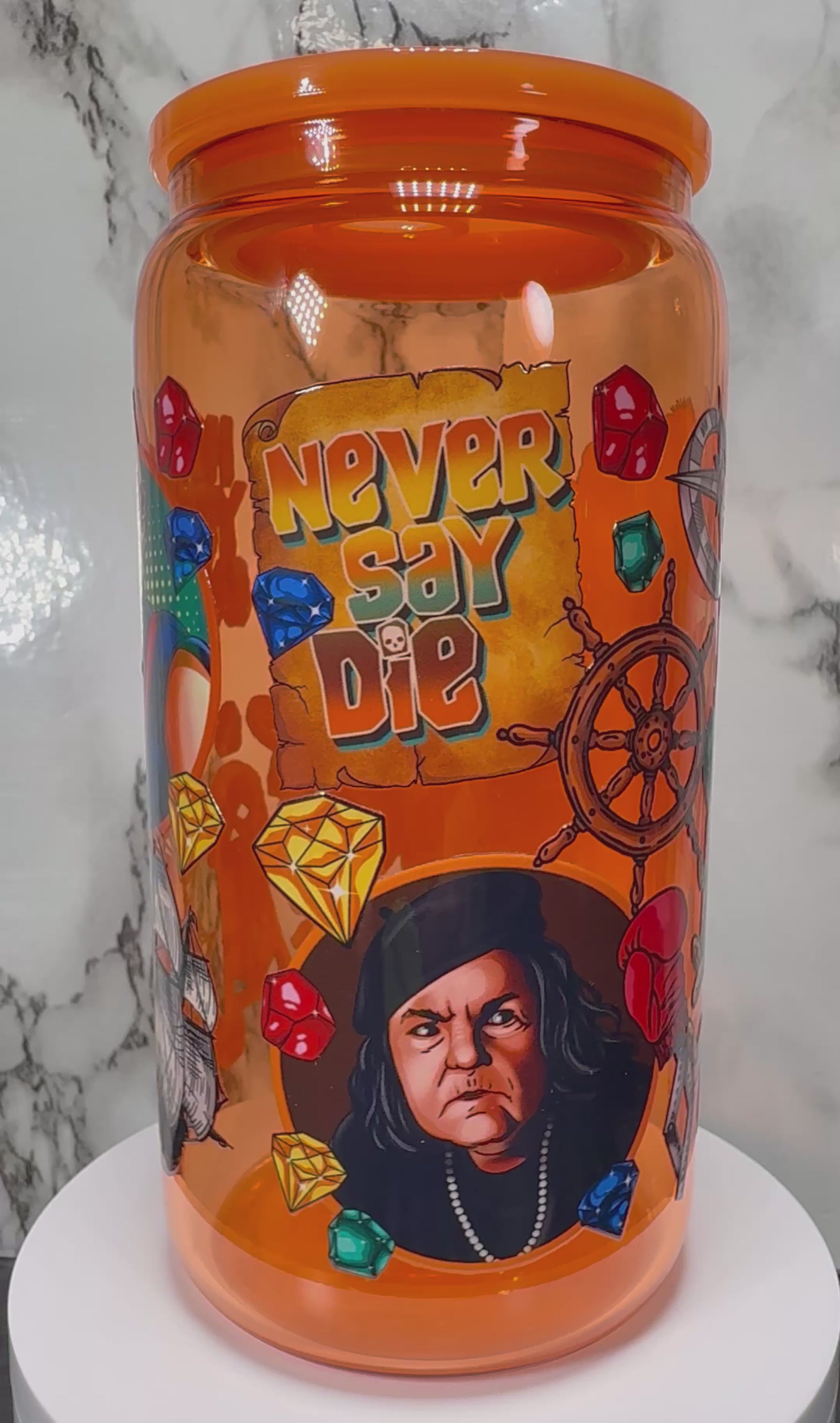 Goonies UVDTF on a orange beer can glass