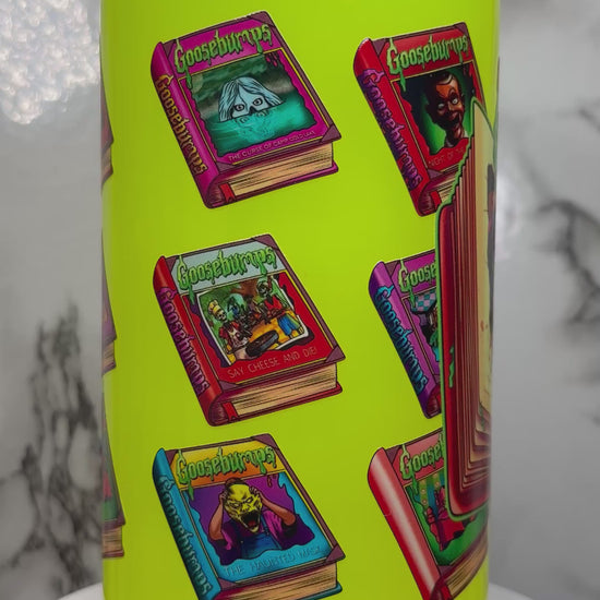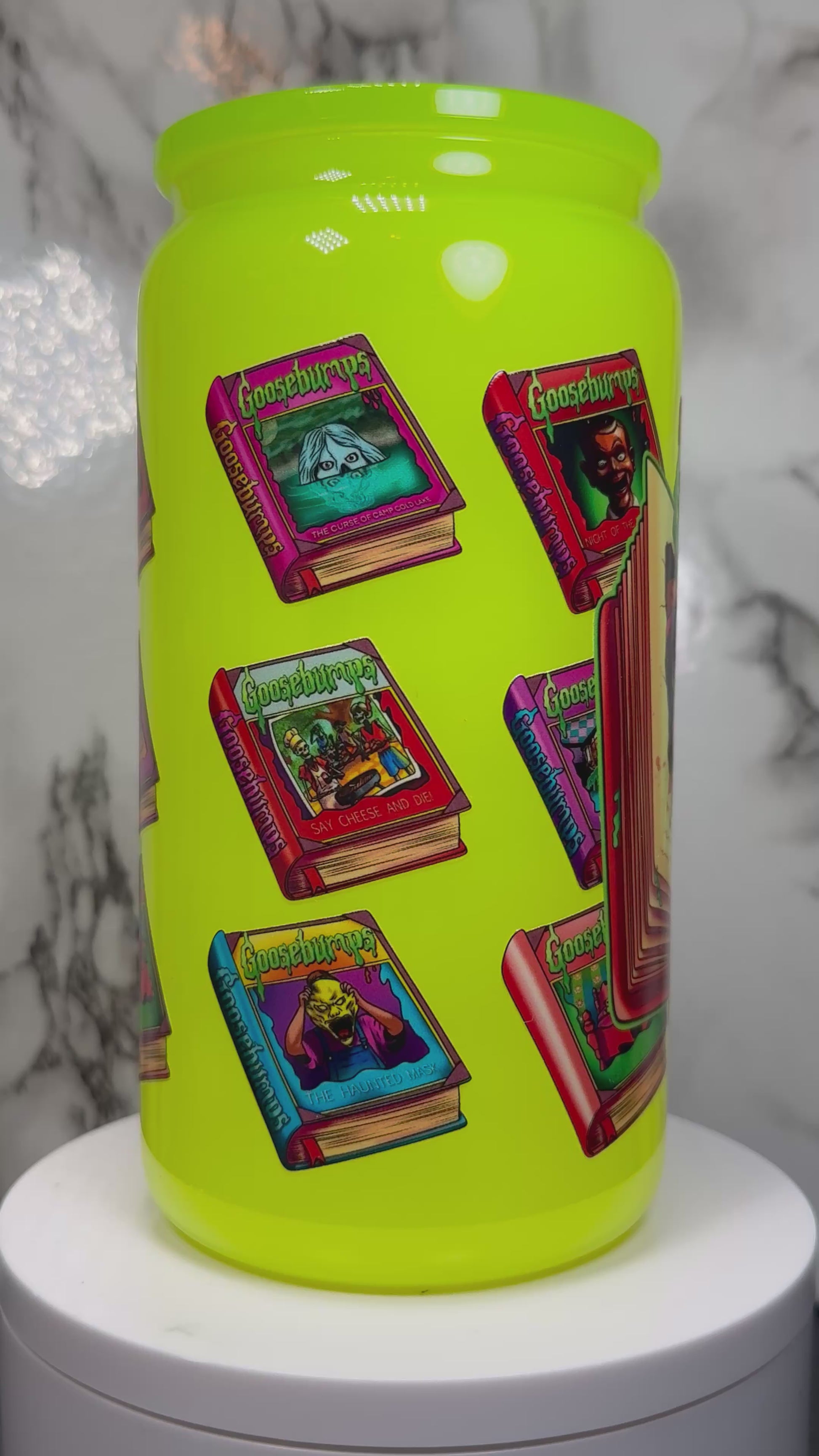 Goosebumps UVDTF on a highlighter yellow beer can glass