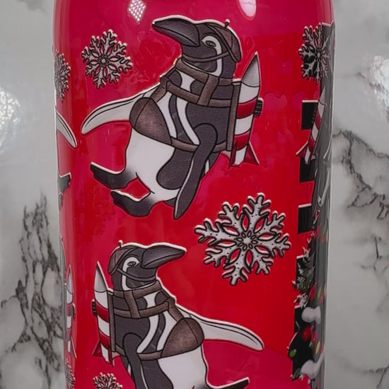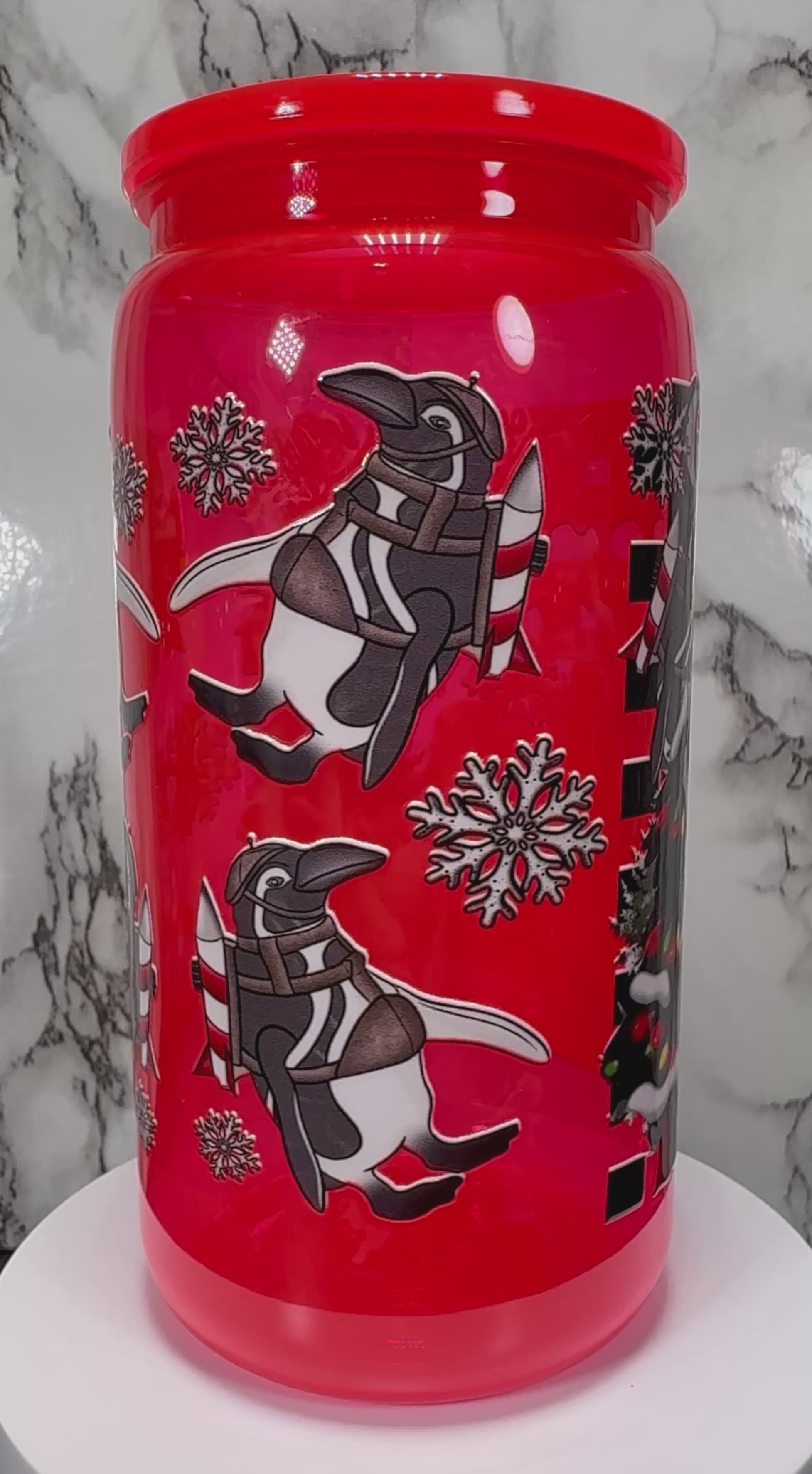 Gotham City Penguin UVDTF on a bright red PLASTIC beer can cup