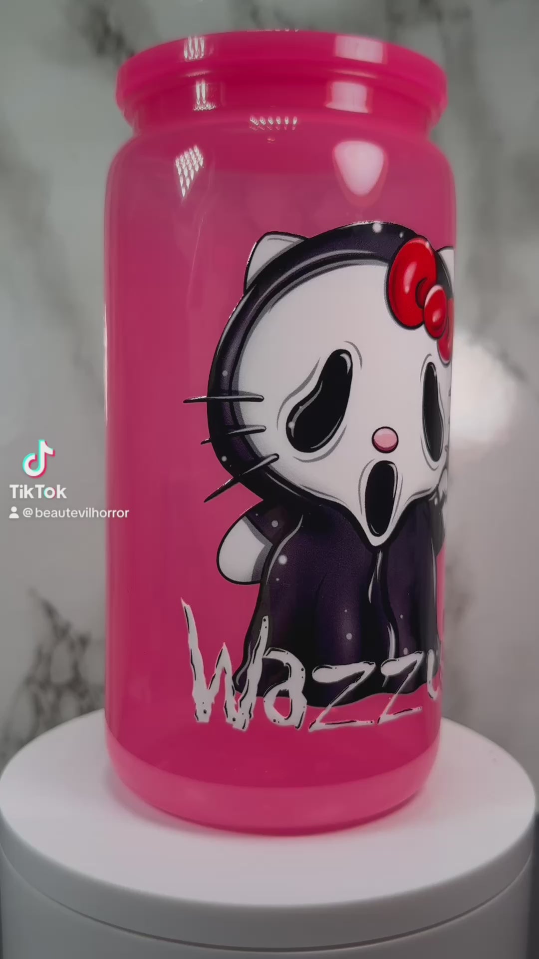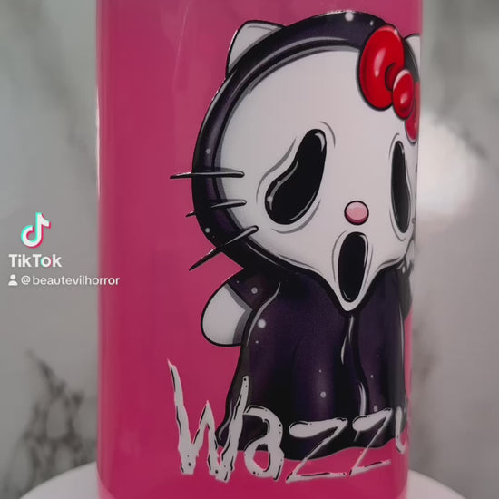 Hello Kitty Scream Ghostface UVDTF on a PLASTIC pink beer can cup