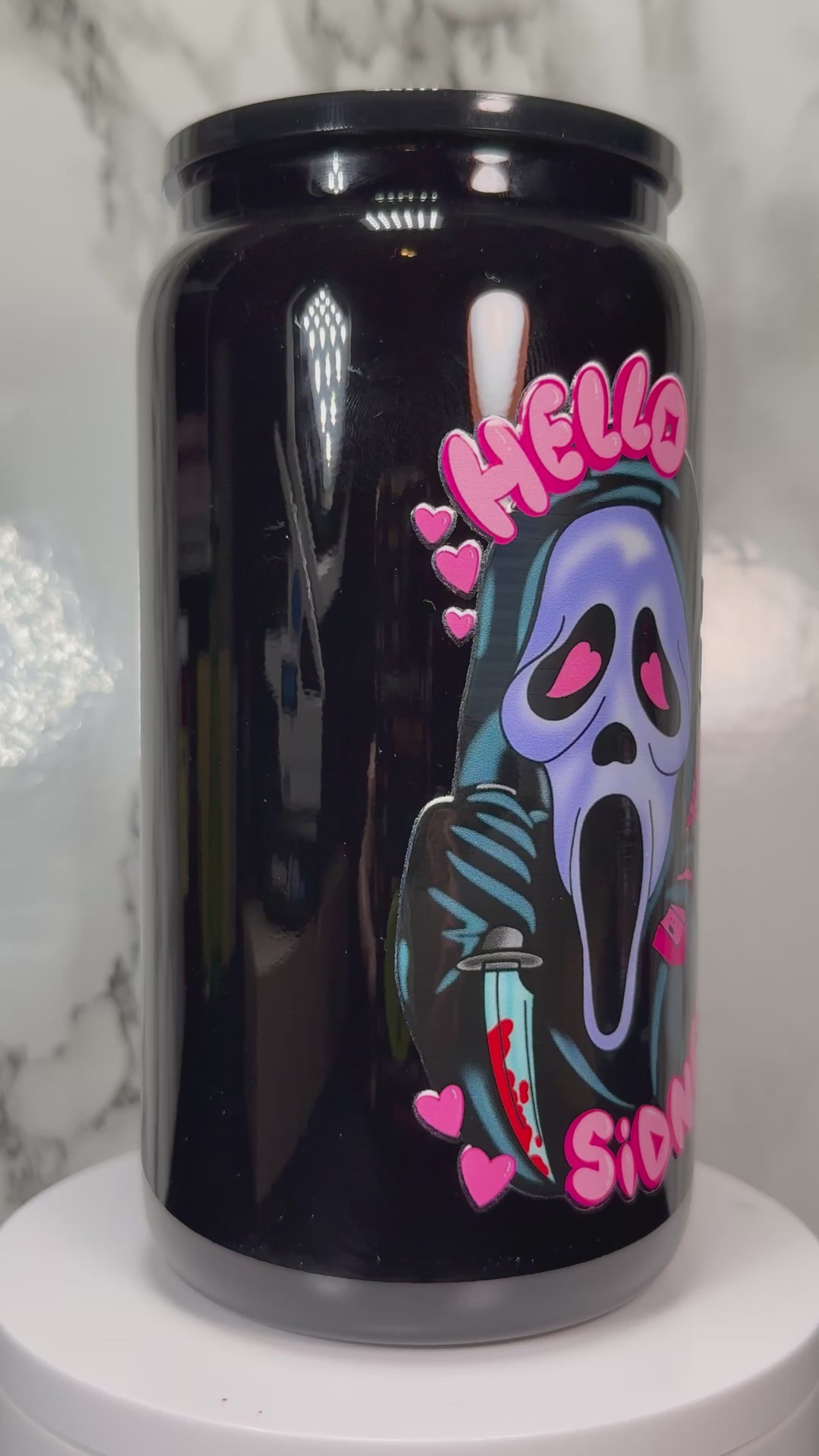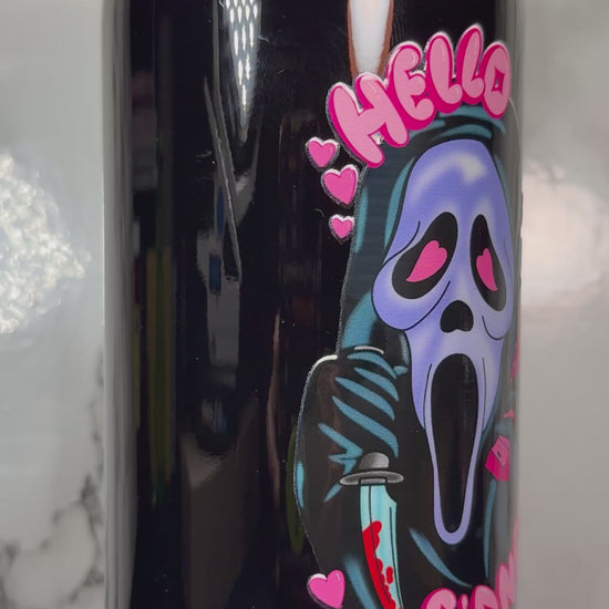 Hello Sidney Ghostface UVDTF on a black beer can glass