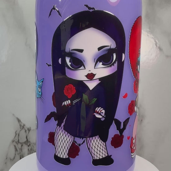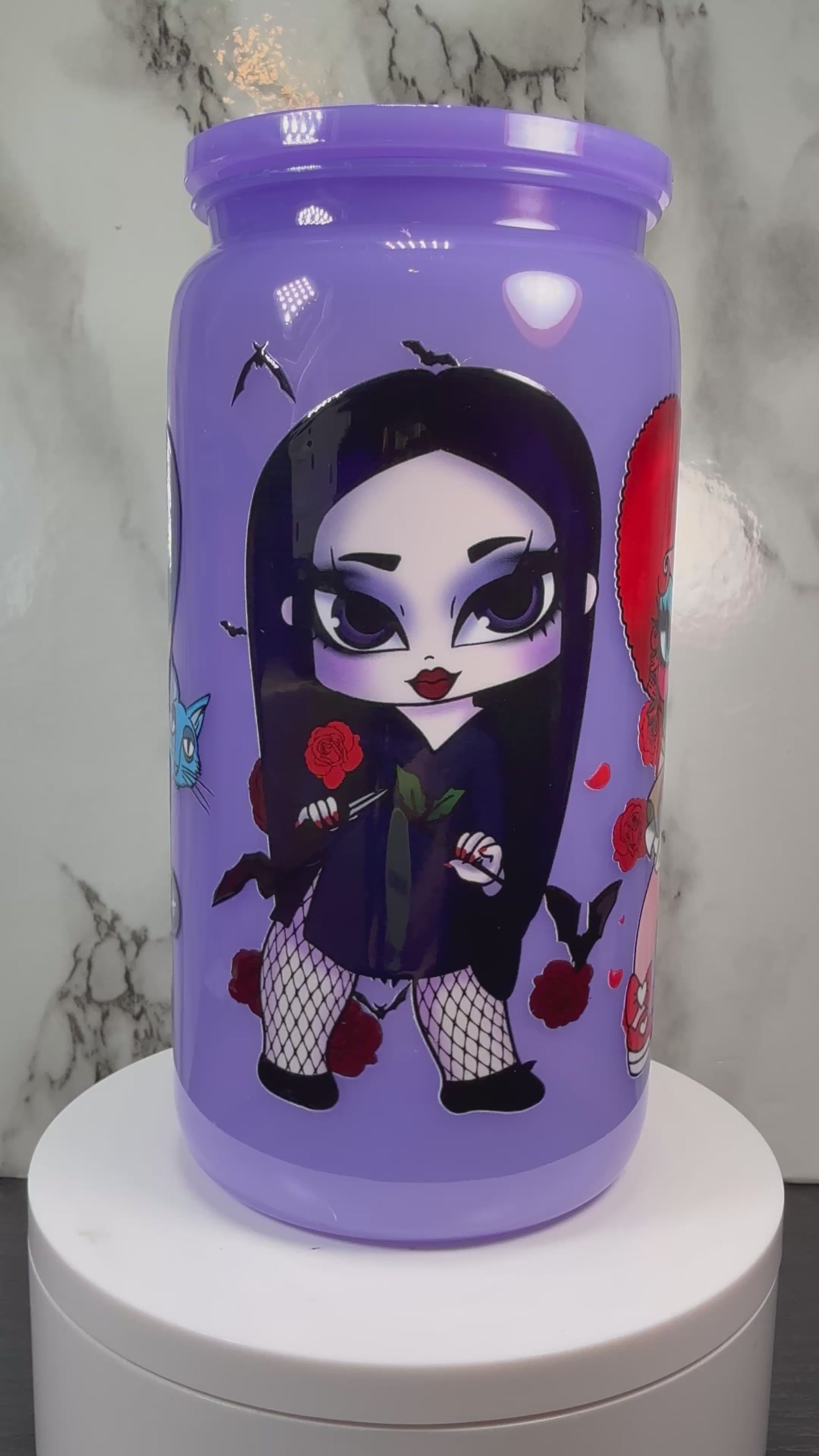 Horror Girls UVDTF on a PLASTIC purple beer can cup