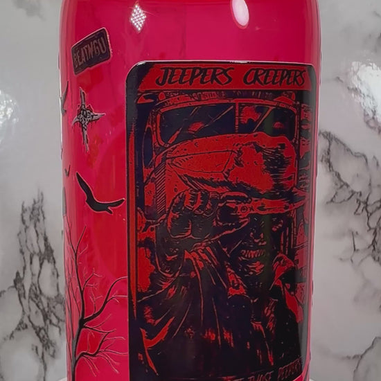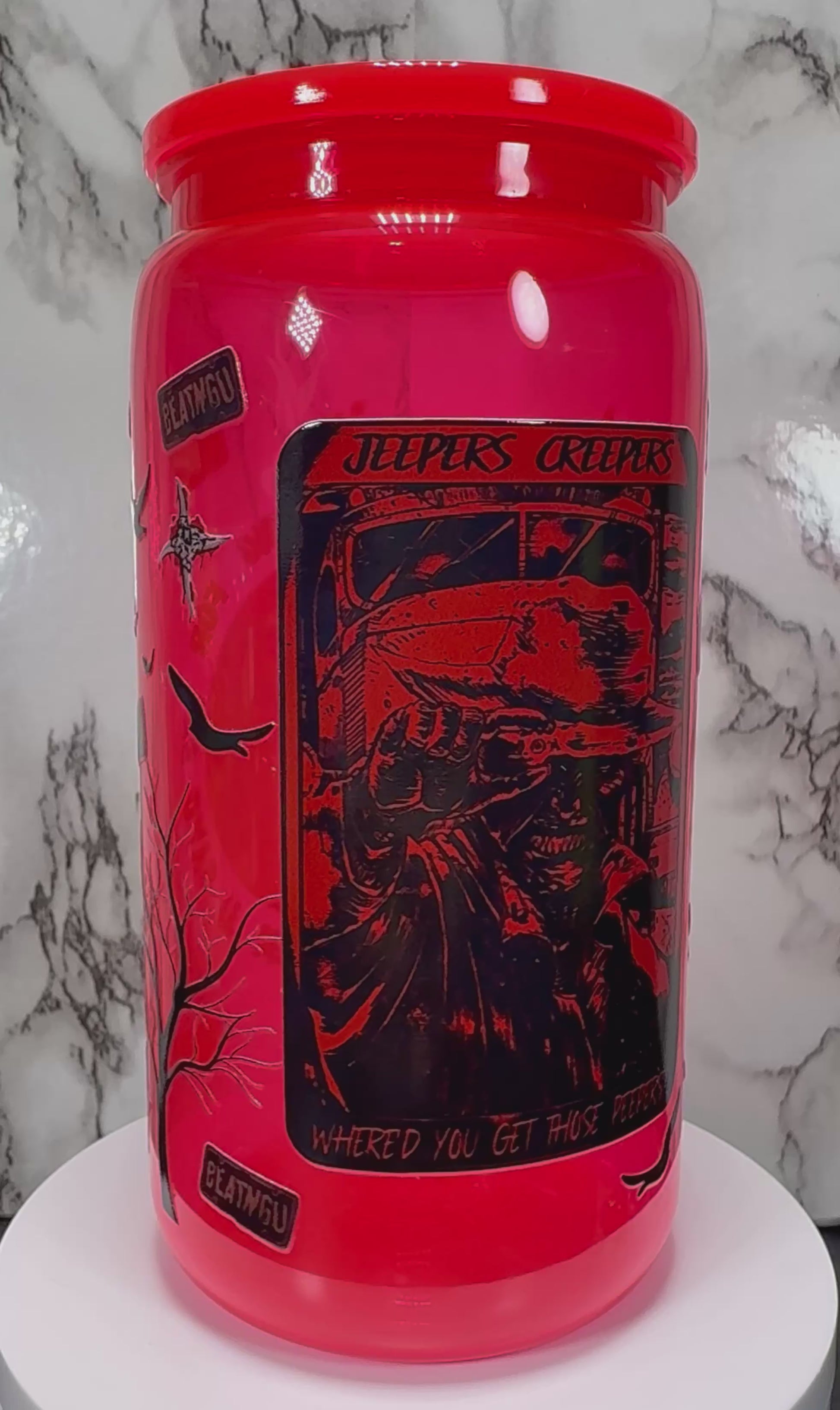 Jeepers Creepers UVDTF on a bright red PLASTIC beer can cup