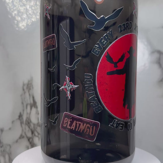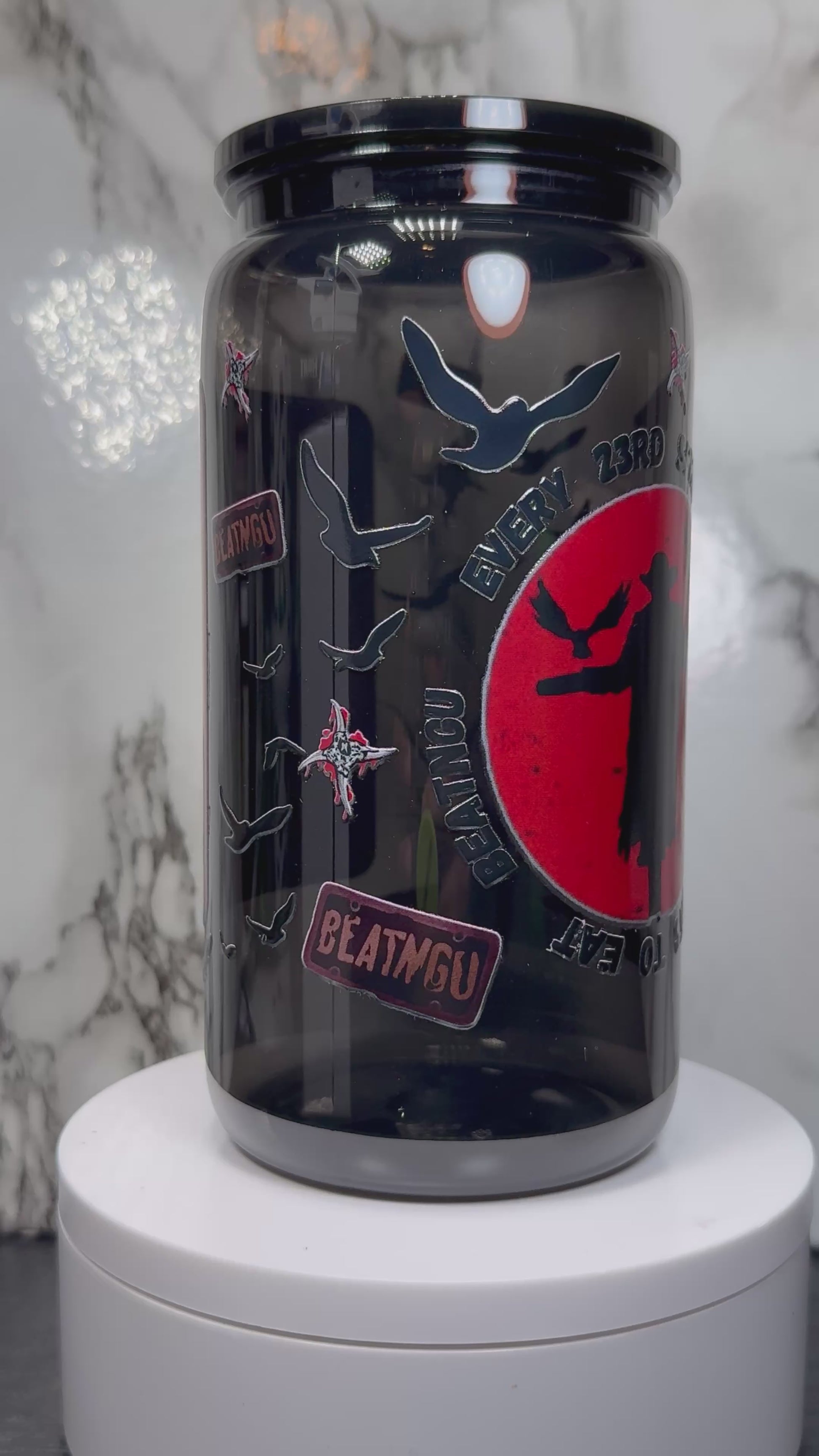 Jeepers Creepers UVDTF on a PLASTIC black beer can cup