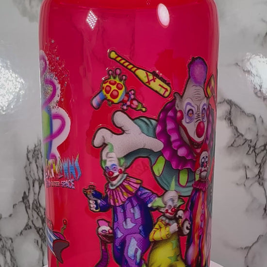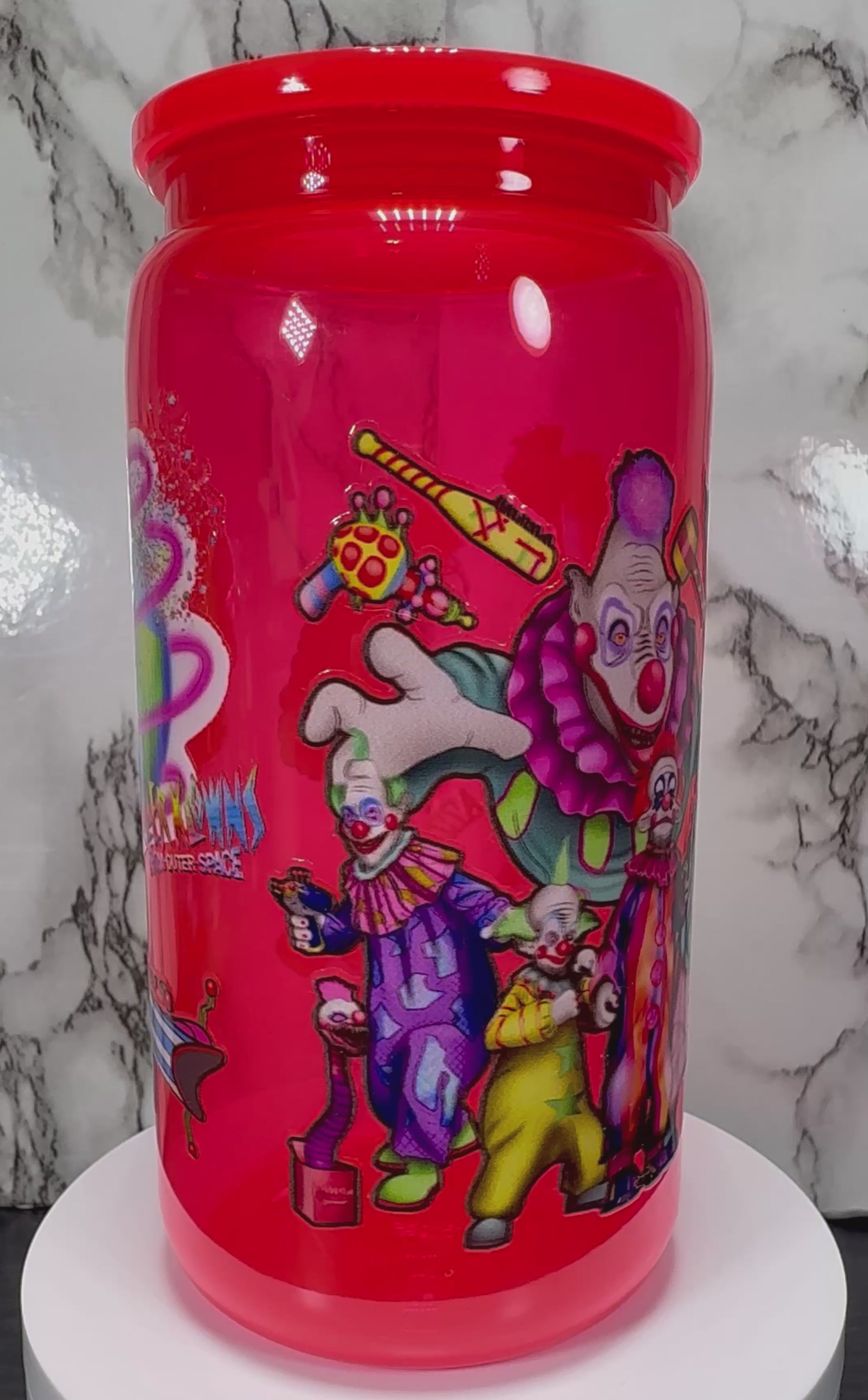 Klownzilla Killer Klowns From Outer Space UVDTF on a bright red PLASTIC beer can cup