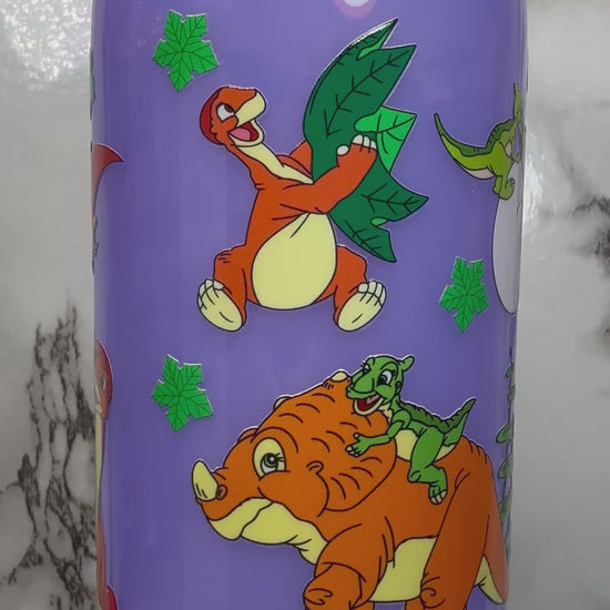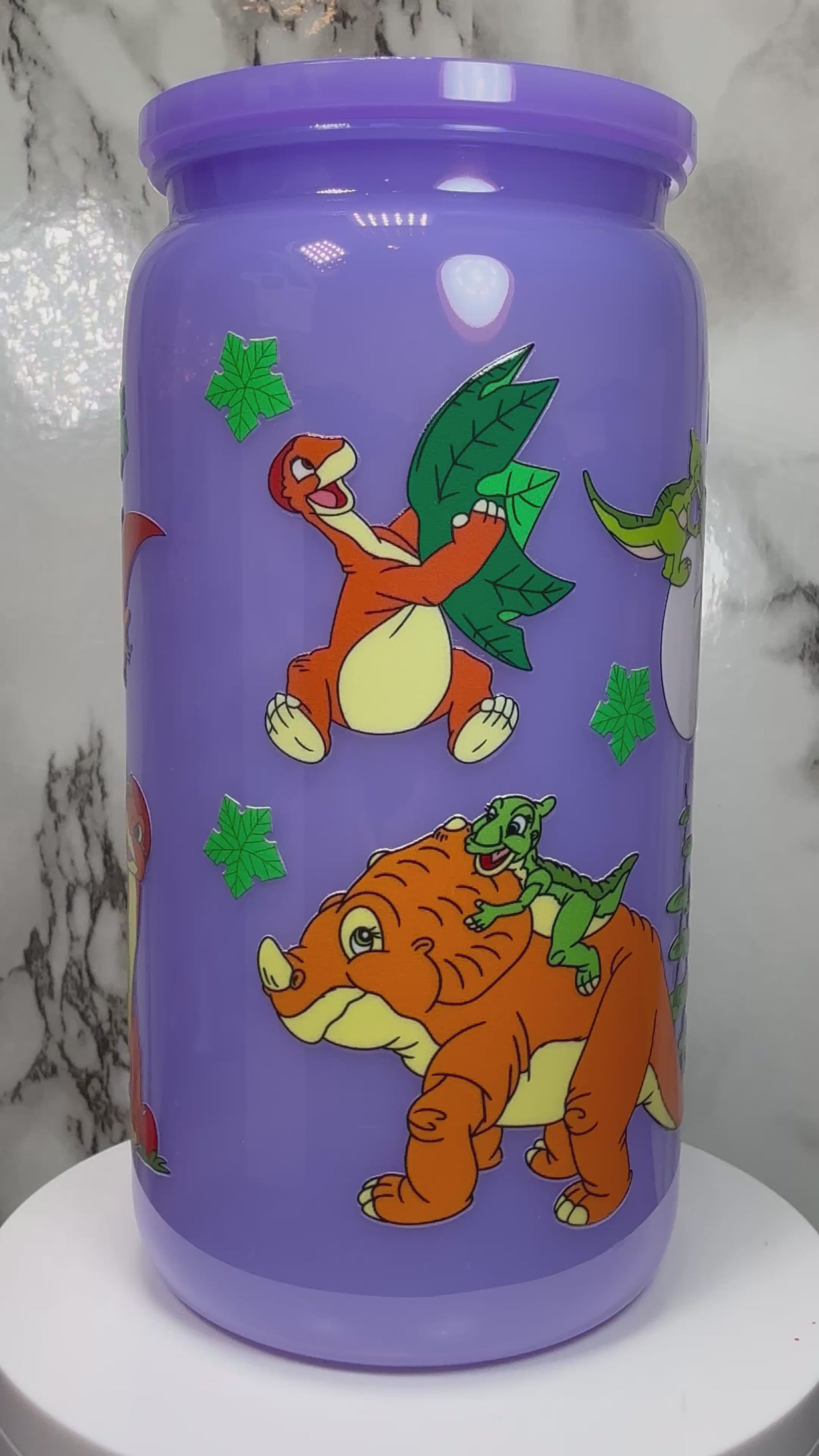 Land Before Time UVDTF on a PLASTIC purple beer can cup