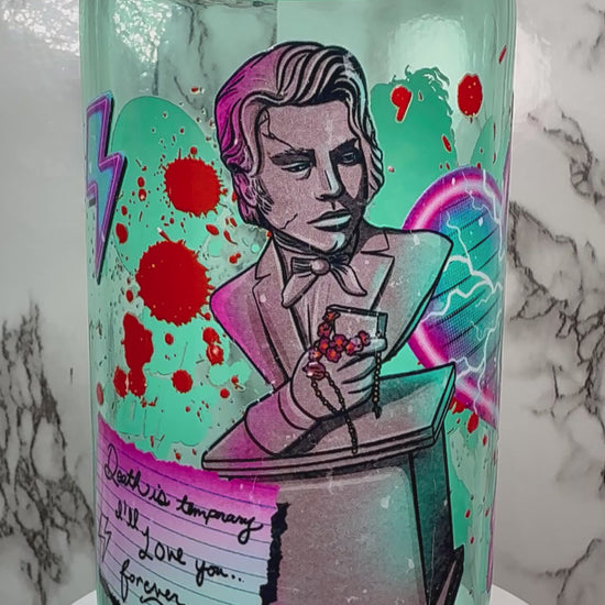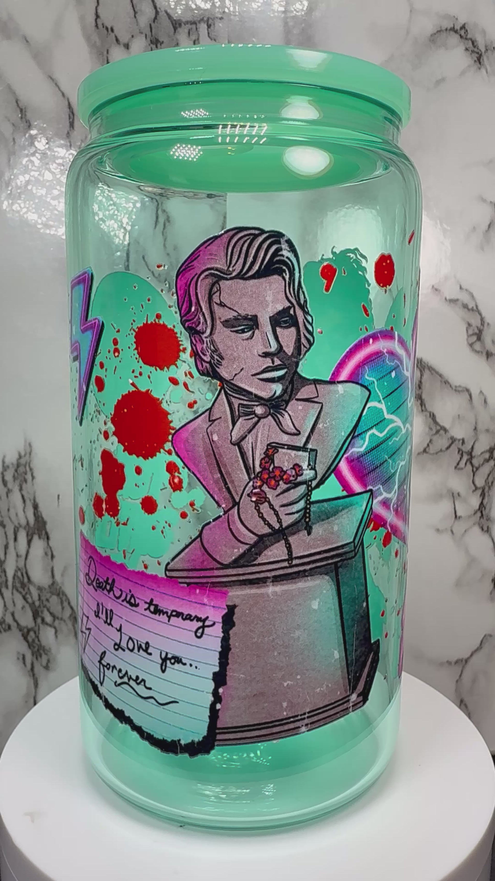 Lisa Frankenstein UVDTF on a teal beer can glass