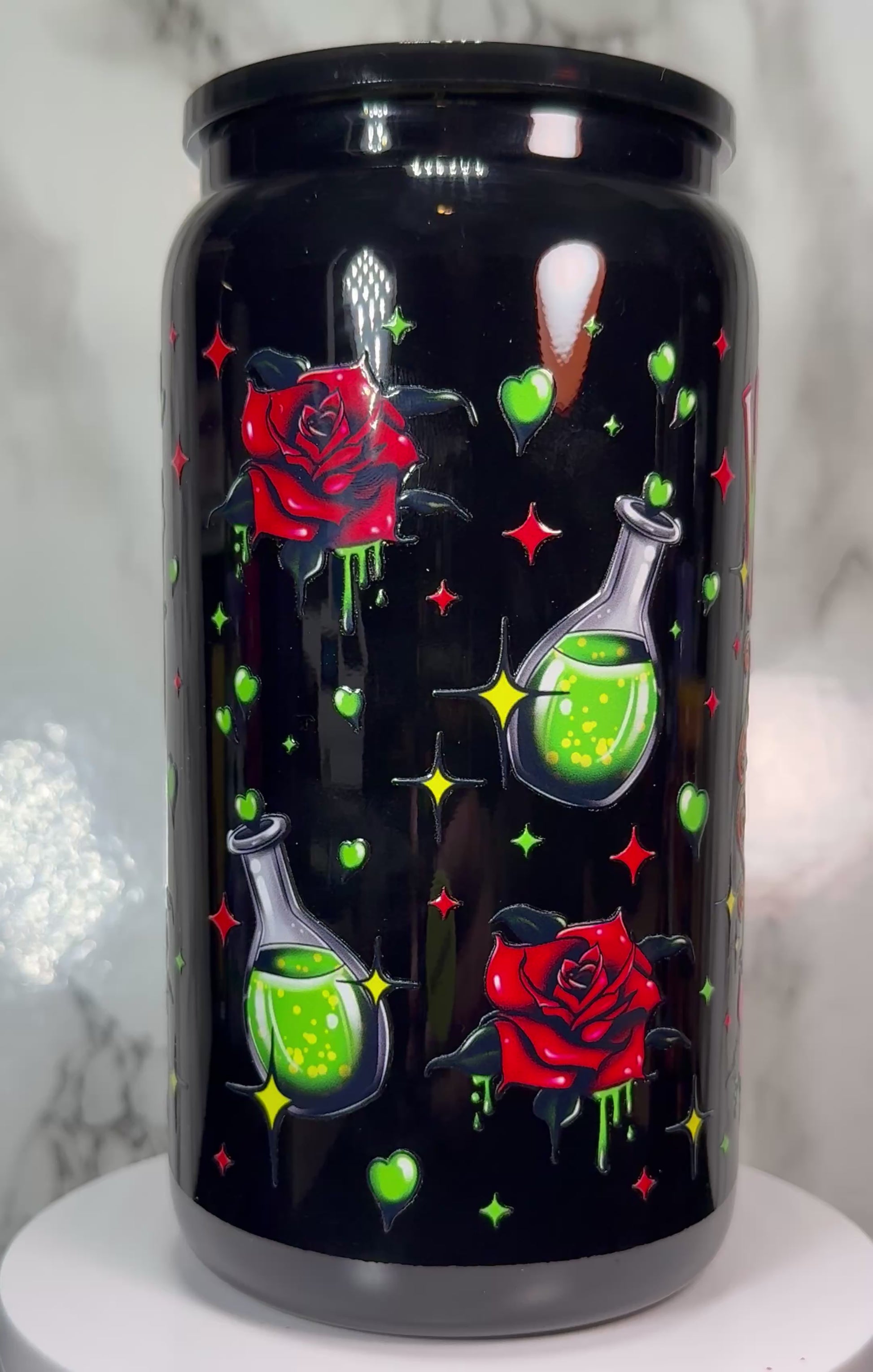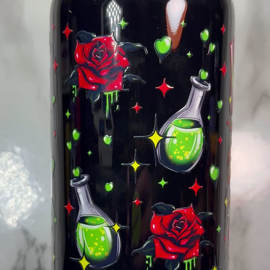 Love is Poison Wednesday Addams Valentine’s Day UVDTF on black beer can glass