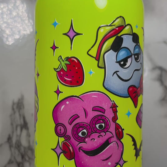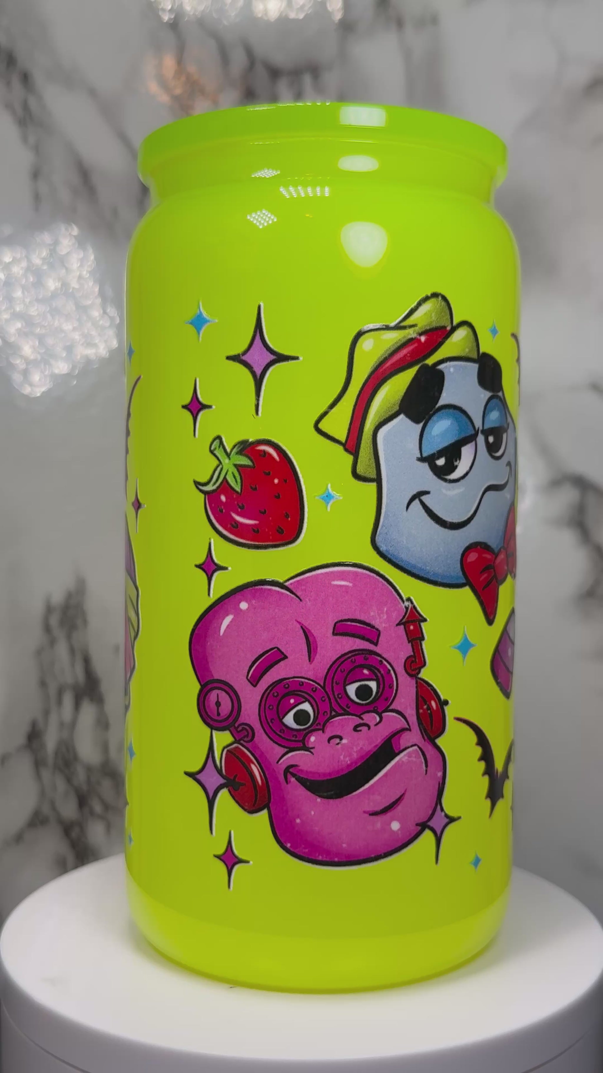 Monster Cereal UVDTF on a bright yellow beer can glass