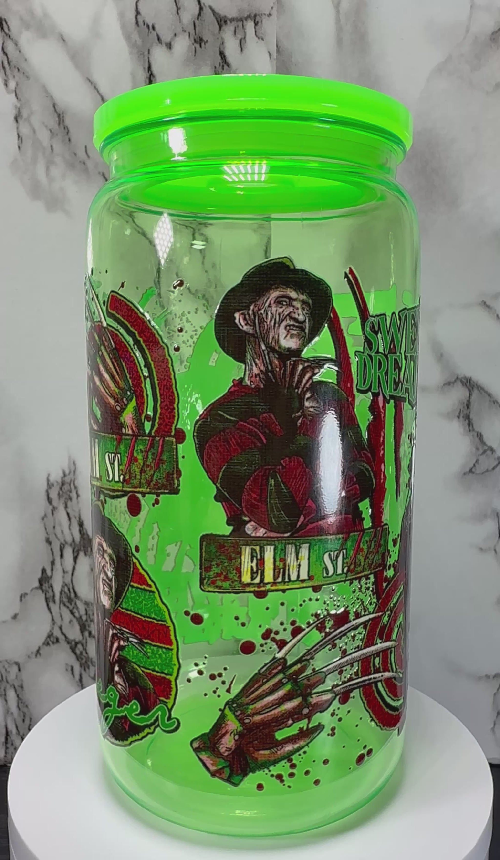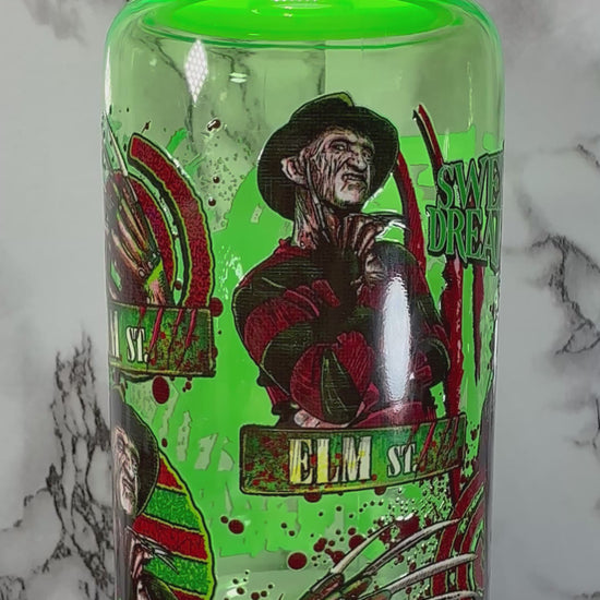 Nightmare on Elm Street Freddy Krueger UVDTF on a bright green PLASTIC beer can cup