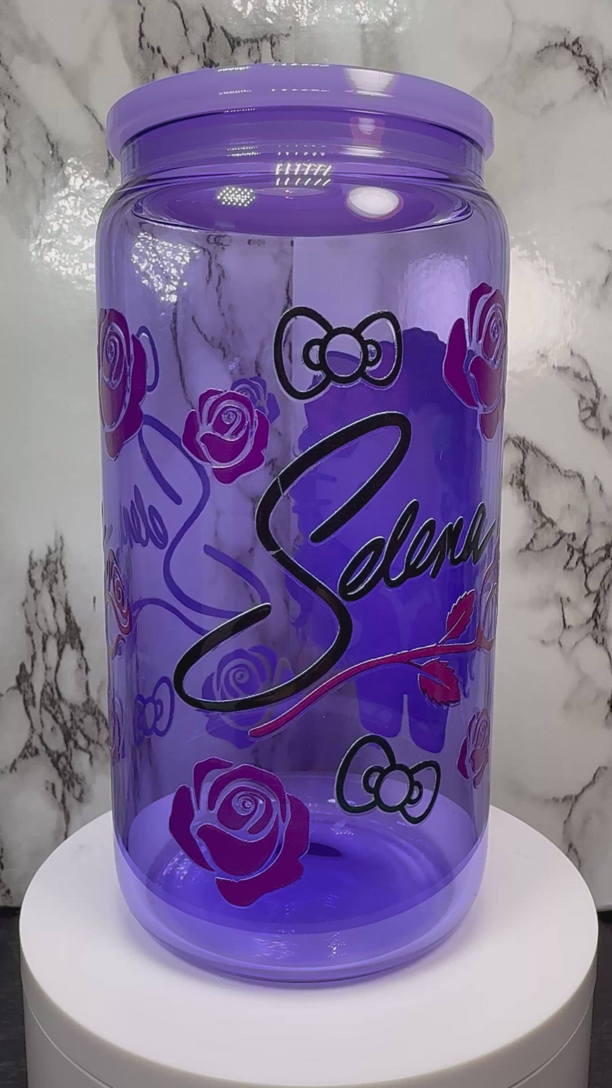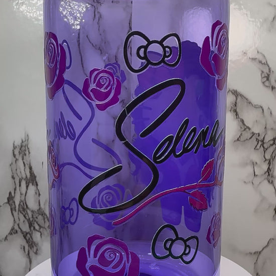 OOPSIE sale PLEASE read description!!! Hello Kitty Selena UVDTF on a purple beer can glass (Faults are in pictures)