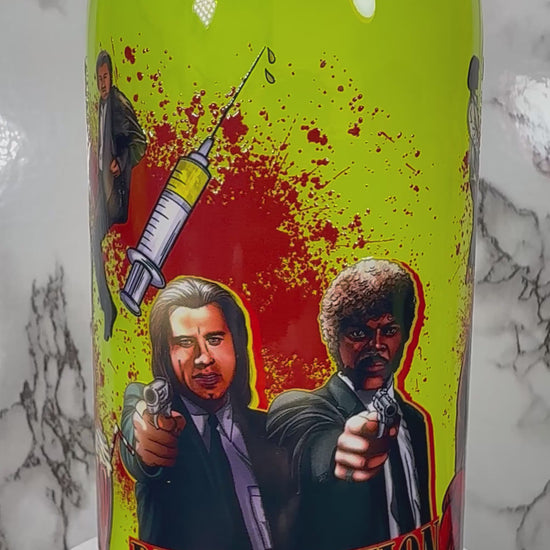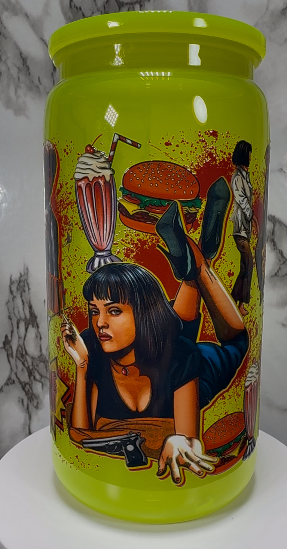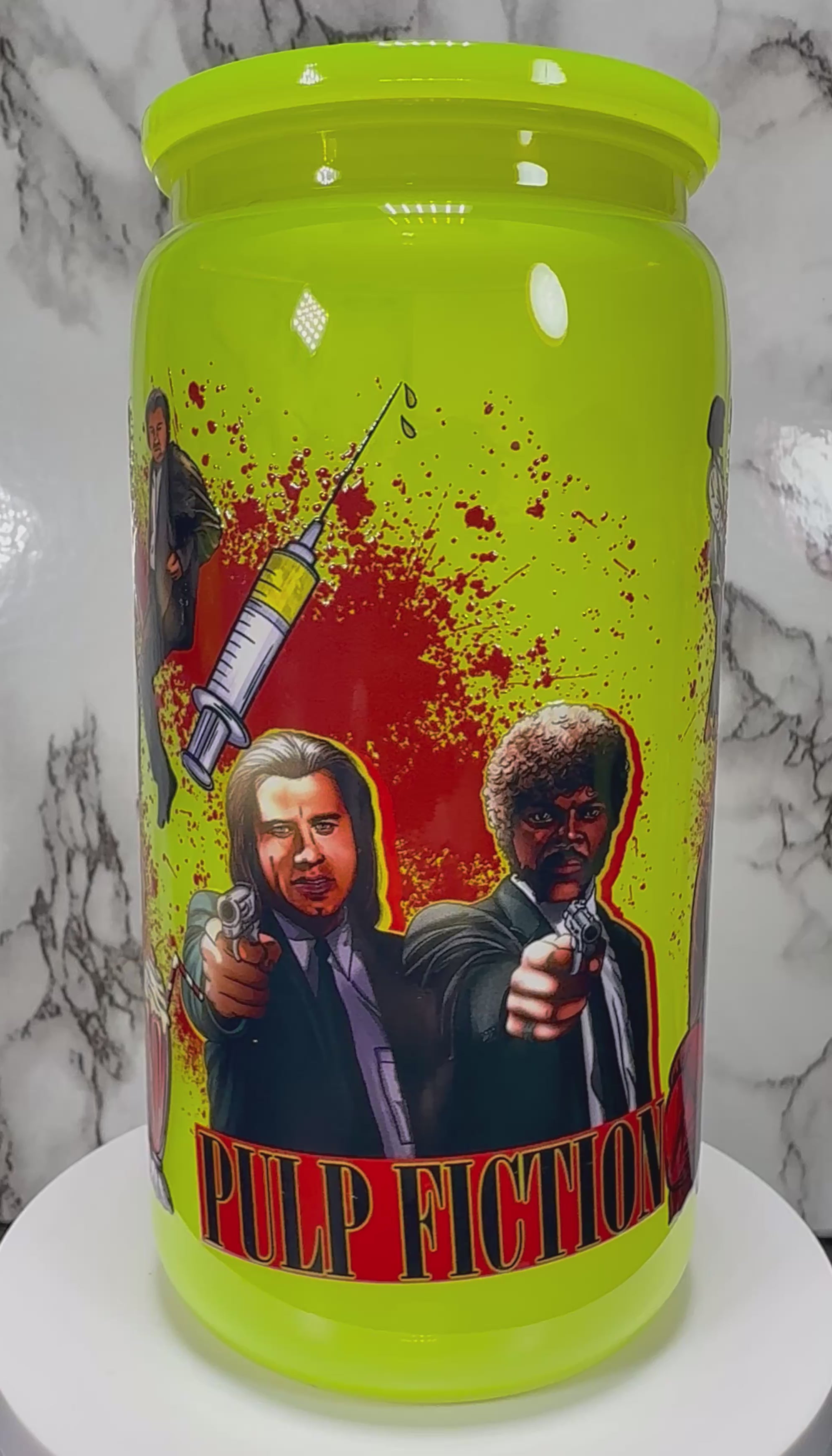 Pulp Fiction UVDTF on a bright yellow PLASTIC beer can cup