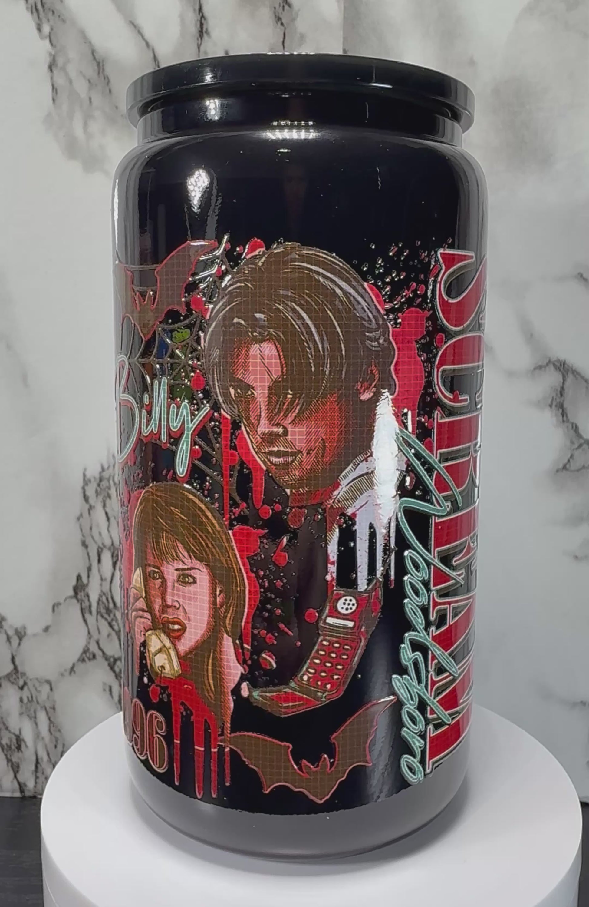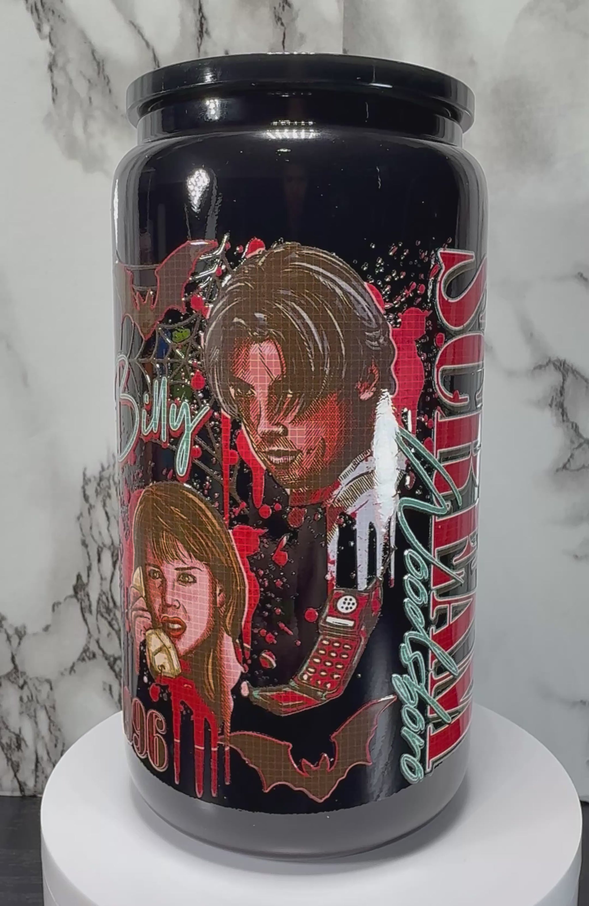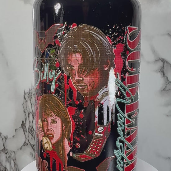 Scream Movie Ghostface UVDTF on a black beer can glass