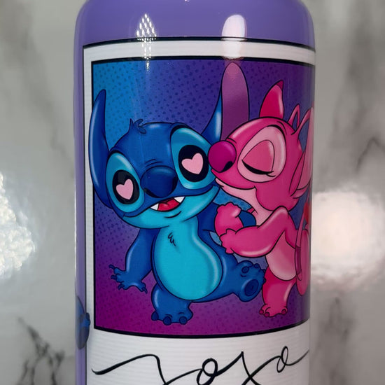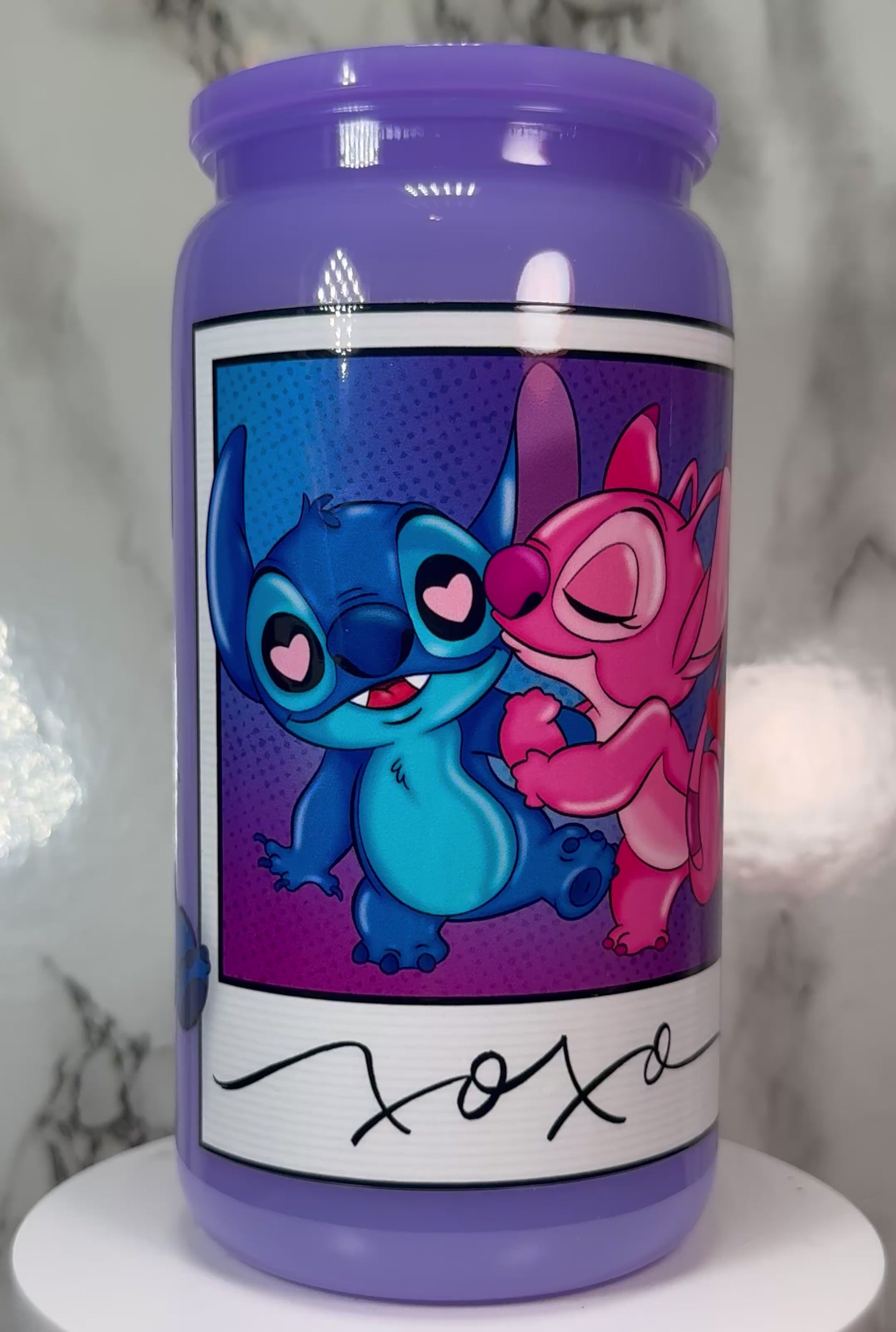 Stitch & Angel Polaroid UVDTF on a plastic purple beer can cup