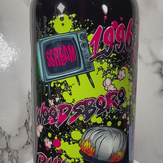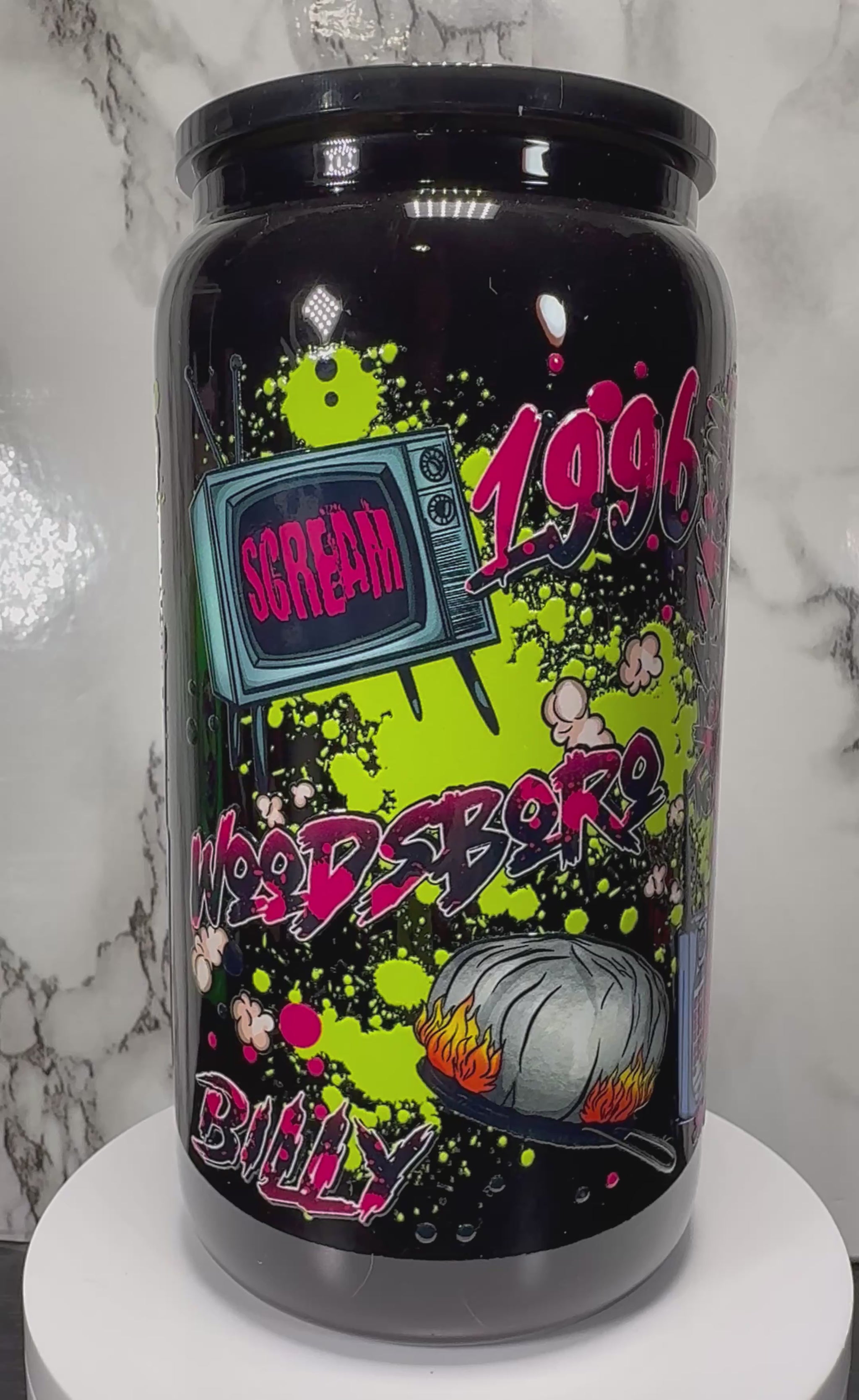 1996 Scream Cast Green UVDTF on a black beer can glass