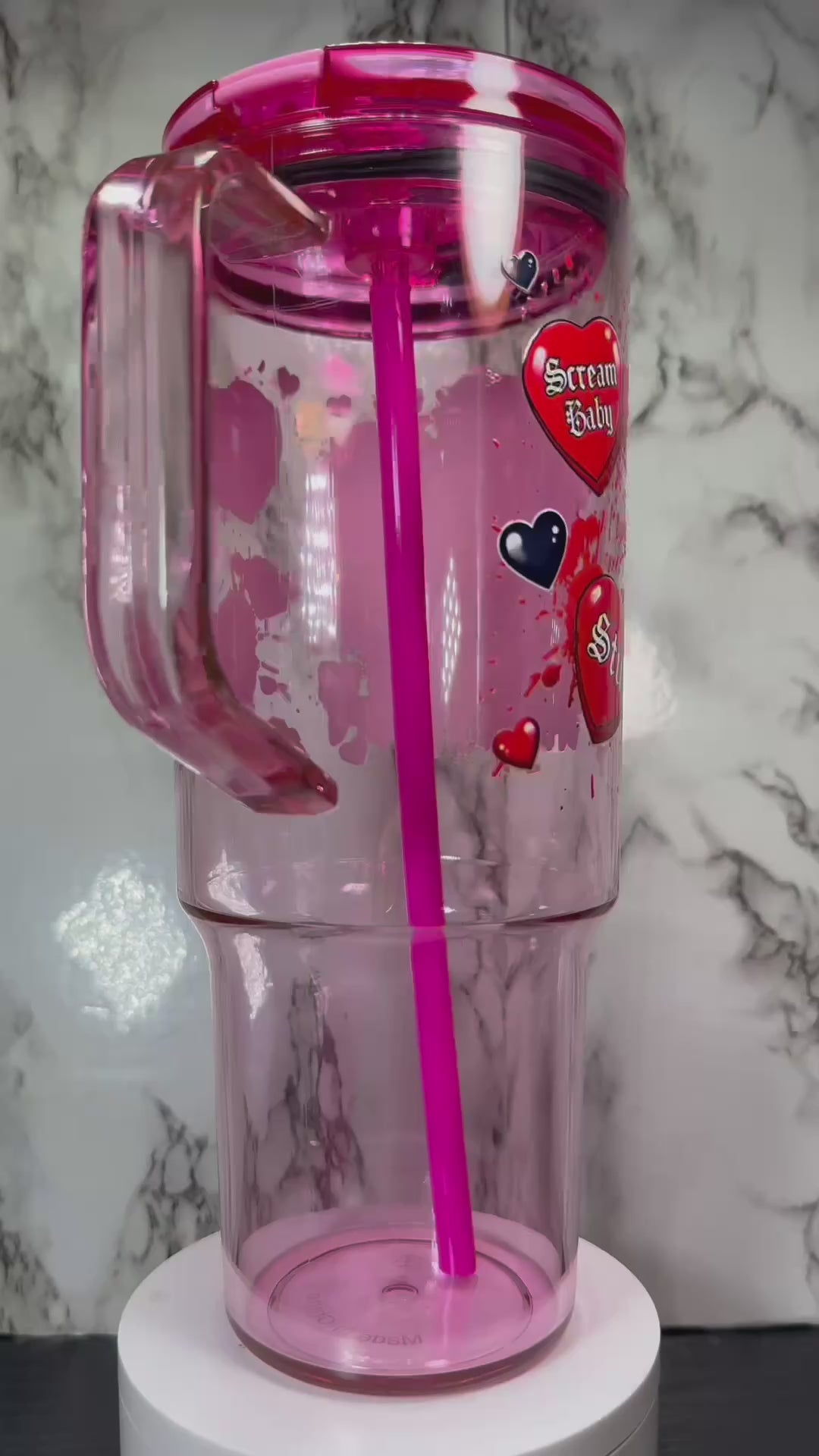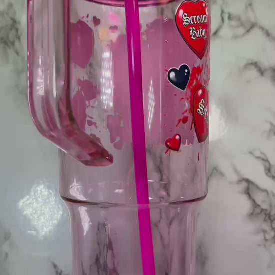 Valentine’s Day Stu Macher UVDTF on a 40oz pink acrylic tumbler